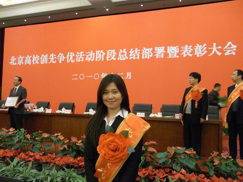 学生十佳共产党员;2010年6月,获第六届“挑战杯”首都大学生创业计划竞赛金奖;2010年4月,获第三届“全国高等院校学生语言文字基本功大赛”一等奖;2010年3月,在中共北京市委教育工作委员会举办的“首都大学生廉洁文化征文活动”中获二等奖;2008年10月,被评为首都教育系统奥运工作优秀学生;2008年9月,被评为首都大学生奥运村(残奥村)住宿服务团队“服务标兵”;2008年10月,被评为首都大学生新世纪英才学校2008级骨干志愿者;2007-2008年度,被评为漫画网站