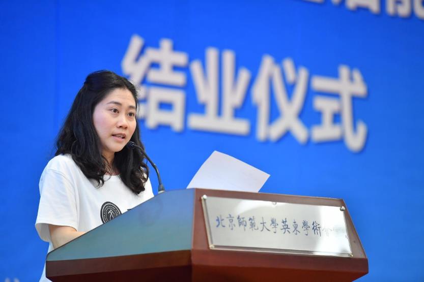 澳门教育及青年发展局语言推广中心主任黄洁如致辞。黄洁如主任感谢合作单位和各位老师积极参与,祝贺学员顺利结业。今年采取线上线下结合的创新形式,北师大提供专业的支持,培训内容提升了学员的普通话水平和对中华传统文化的理解以及普通话教学能力。澳门特区政府十分重视学生的普通话教育,这次培训为澳门提升普通话教育品质,培养有良好普通话教学水平的教师团队有重要意义。期待未来保持交流合作,把所学融入日常教学,促进普通话推广发展。