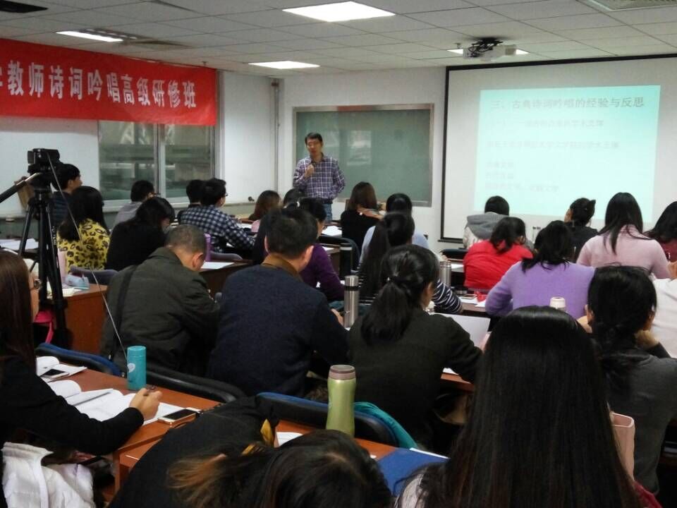 诗词吟唱入门》的讲座。谢老师先从诗歌与音乐、字音与乐音、格律与旋律、情感与形式等四方面进行诗词吟唱的理论指导,旁征博引,引经据典,生动的讲解把学员带进诗词吟诵的“前世今生”中。讲座中,谢老师善于调控课堂气氛,通过互动、交流、讨论等方式,让课堂活跃起来,钟屋小学的杨月华老师用字正腔圆的粤语朗诵李清照的《声声慢》,把课堂氛围带到了高潮。在理论学习之后,谢老师的助教、南山诗社前社长余丹以《问刘十九》、《泊船瓜洲》等诗词为教例,指导学员学习吟唱,歌声萦绕,音律流连,极大地激发了学员们的学习热情。这堂课让学员学以致用,将诗词理论与技能学习相结合,真正地提升了学员的诗词吟唱素养。