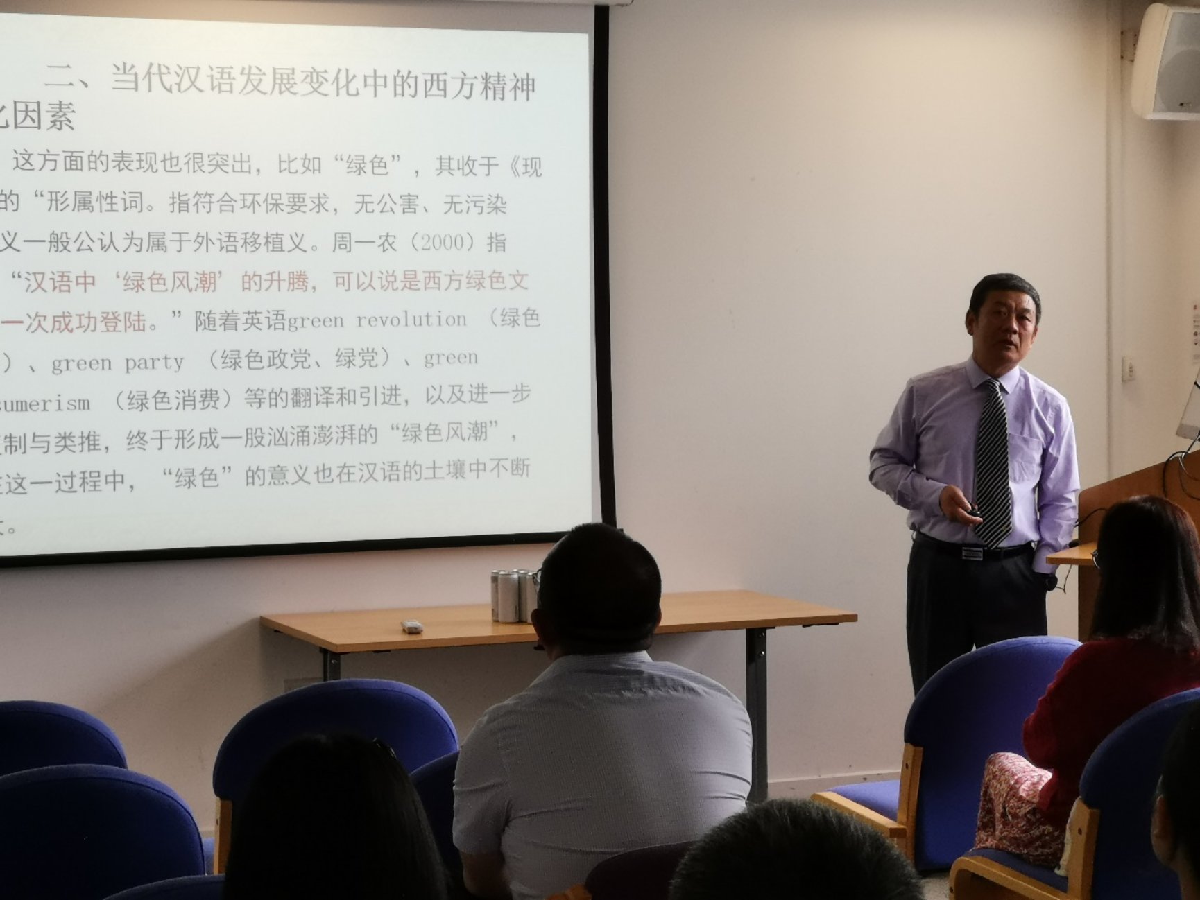 副院长杨利慧教授受邀以“中国的龙神话——兼谈跨文化交流中的理解之路”为题,做了大会主旨发言。她指出:在各类具有代表性的中国文化符号中,“龙”大约是跨文化交流语境中引发争议和冲突最频繁的一种——中国龙被普遍赋予的神圣性与西方文化中常见的恶龙形象形成了鲜明对比,往往成为中西文化和族群冲突的缘由。有鉴于此,加强对中西不同文化语境中多元的龙形象的理解,便成为消解冲突、促进“民心相通”与“文明互鉴”的重要路径,也是跨文化交流与教学中的应有之义。她对中国神话中龙的多元形象和意涵的介绍分析引起了听众的热烈讨论——威尔士的红龙是西方文化中不多见的正义与勇敢的化身,也是威尔士国家的象征,因此关于龙的讨论适得其所。 王庆副教授就“文人书法及相关问题”与参会者进行了交流。他认为书法是中国的一项传统艺术形式,底蕴深厚,可是现代书法却有不少隐忧:从事者大都从技艺的角度去追求,忽视了书法之外的功夫。他因此提倡“文人书法”,并思考书法的教育涵化功能,以从理论和实践上传承中国书法艺术,促进文化交流。 刁晏斌教授的发言紧扣会议主题,论述了“当代汉语发展变化中的西方文化因素”,指出当代汉语的发展变化在很大程度上是中西文化交流与交融的产物,其中西方物质文化因素、精神文化因素以及行为文化因素等,都对当代汉语产生了影响,值得从语言和文化双重角度予以总结和研究。他主张建立当代语言发展变化研究的文化视角以及当代文化发展变化的语言视角,认为当代语言及其发展恰可为对外汉语教学提供绝佳范例。 在紧张的会议间隙,王庆副教授还应会议组织者的邀请,现场进行了书法展示,与书法爱好者进行了交流互动,并书写了“北师大卡迪夫中漫画网站