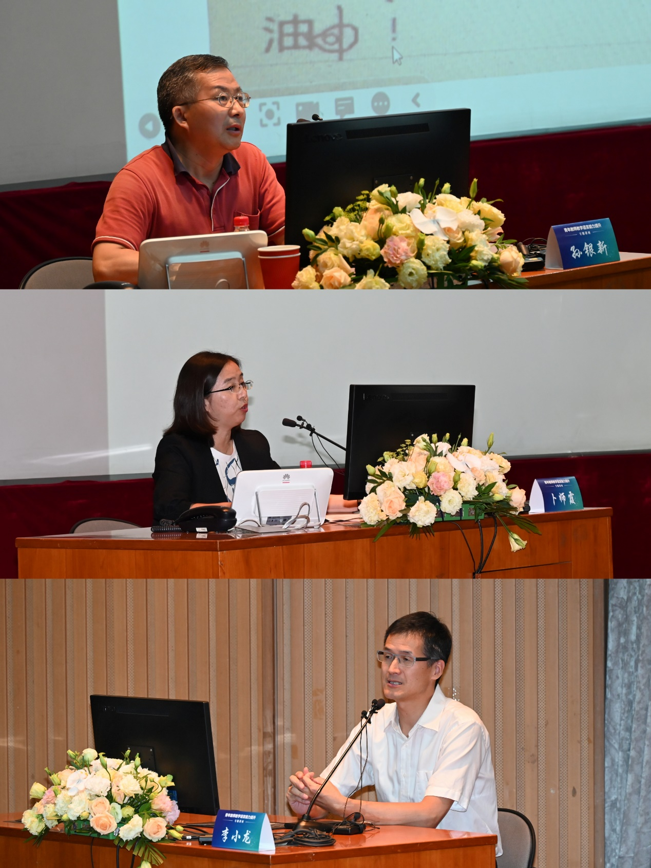 教授孙银新、卜师霞、李小龙围绕提升教学语言能力的主题作讲座。
