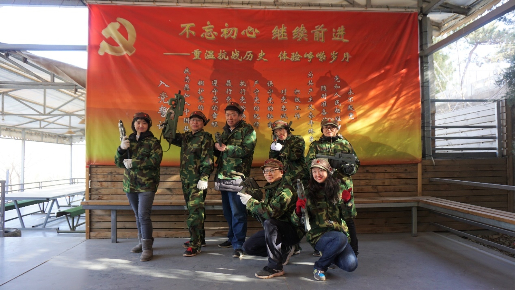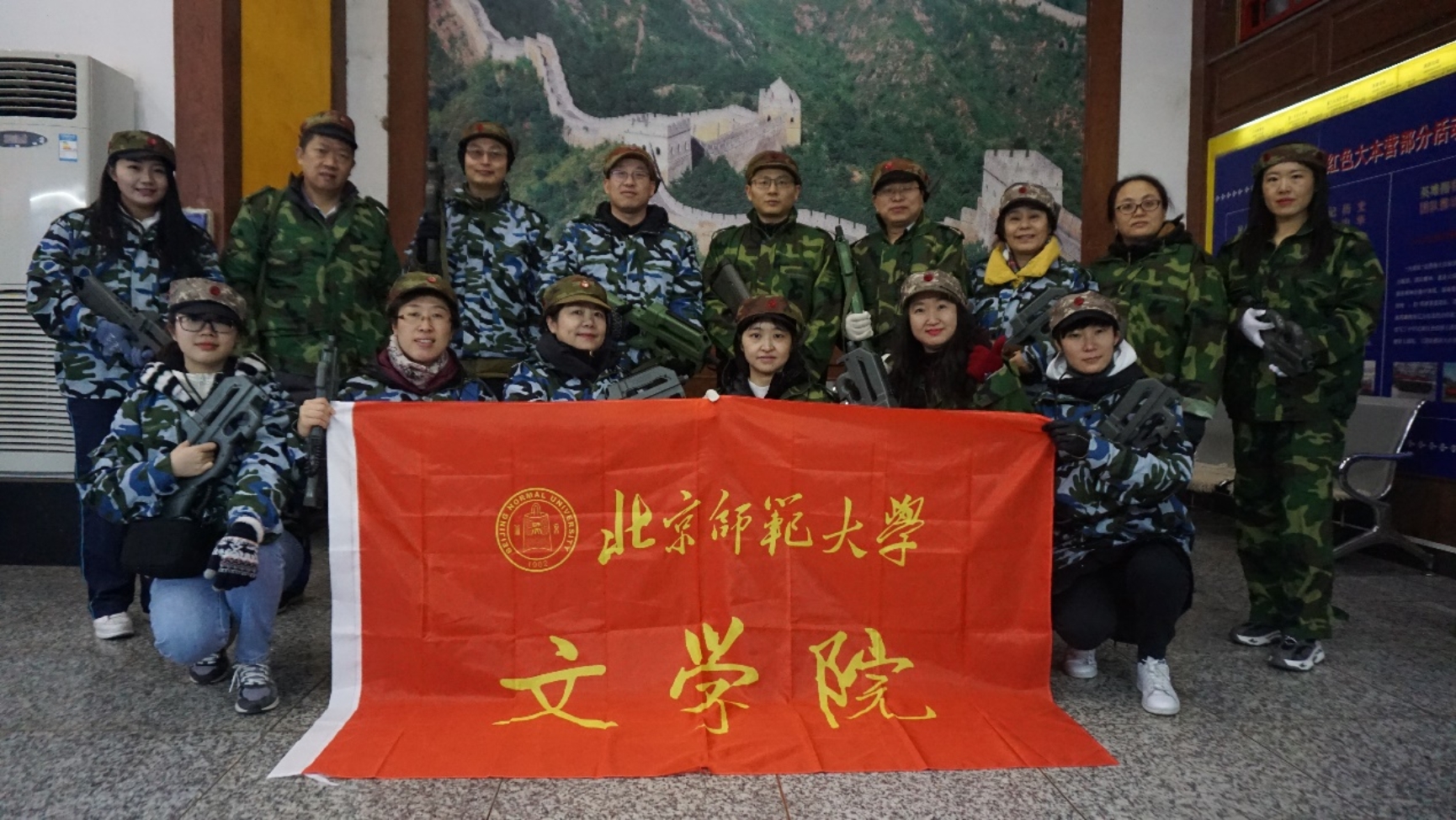 部分教职工参加了本次活动。 活动开始前,老师们分为红、蓝两队,汪高武老师、马然老师分别担任红队、蓝队队长。在教官的指导下,老师们在雪地上开始了第一局得分战,两轮下来老师们逐渐掌握游戏技巧,红、蓝两队最终打成平局。第二局开始游戏改为歼灭战,在战术的配合下,进攻方越来越勇猛,蓝队最后以4:1的得分赢得第二局的胜利。第三局老师们由室外转向室内,在全封闭室内特战堡垒中进行歼灭战。在声光音响效果的配合下,演练更加具有身临其境的激烈感,最终蓝队获得第三局的胜利。经过一个上午的真人CS军事拓展训练,各位老师在欢笑与疲惫中切身感受到了抗战的艰苦卓绝。 拓展训练结束后,老师们到抗战名将纪念馆,参观学习了《十四年抗日战争名战名将专题展》,从中国军民局部抗战时期、国共合作全国性抗战时期、伟大的胜利这三个部分中充分领略到抗日战争的艰难以及伟大的意义,也被先烈前辈们的爱国精神所打动。
