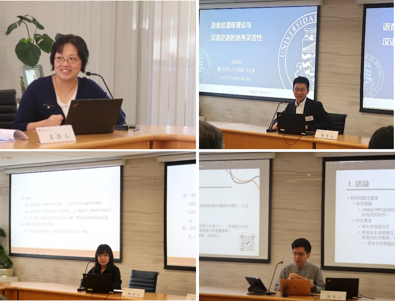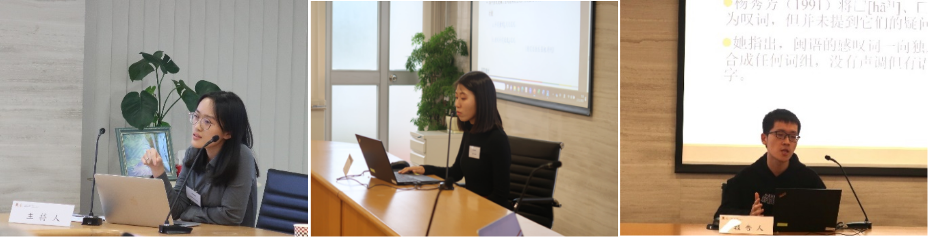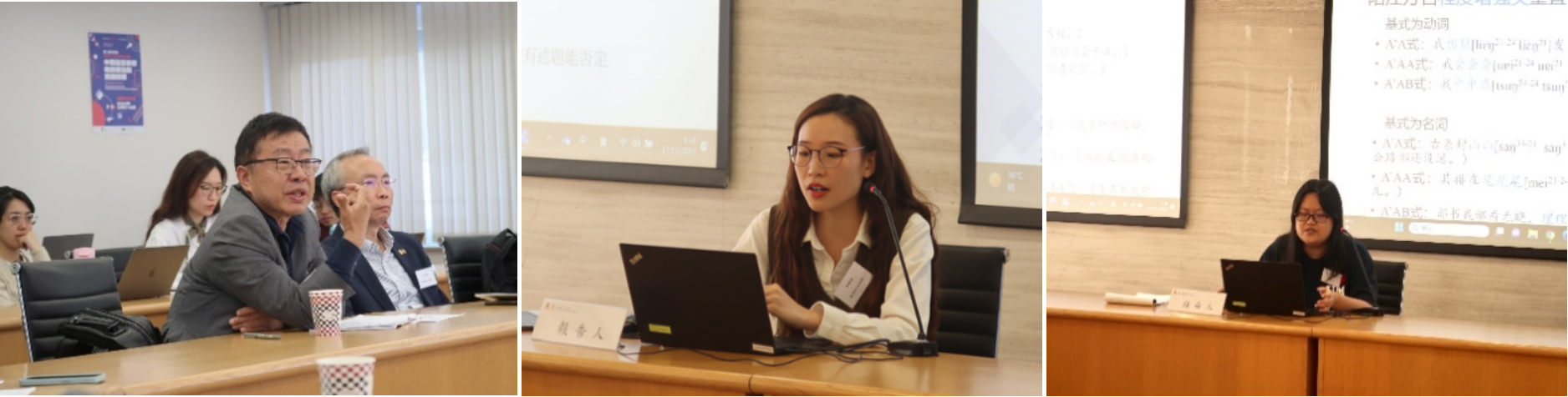 张维佳教授主持,并组织与会学者进行热烈讨论。香港中文大学曾绣薇报告《海南闽语“述-宾-补”格式考论》,利用田野调查所得的第一手语料,系统考察了海口闽语VOR格式,并结合汉语史对其来源进行了探讨。澳门大学戴瑜殷的报告《评价形态学视角下的阳江方言程度义重叠式》,在全面描写阳江方言程度义重叠式的基础上,依托评价形态学视角进一步探讨了其语法形式和表义机制。