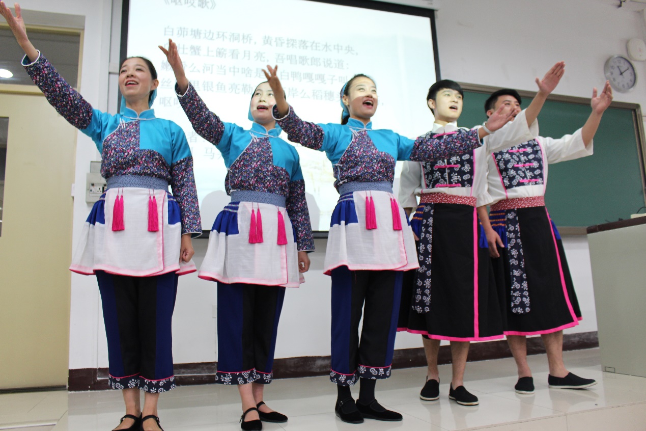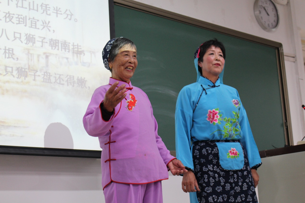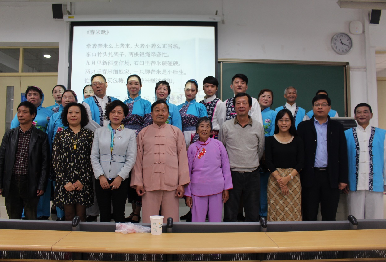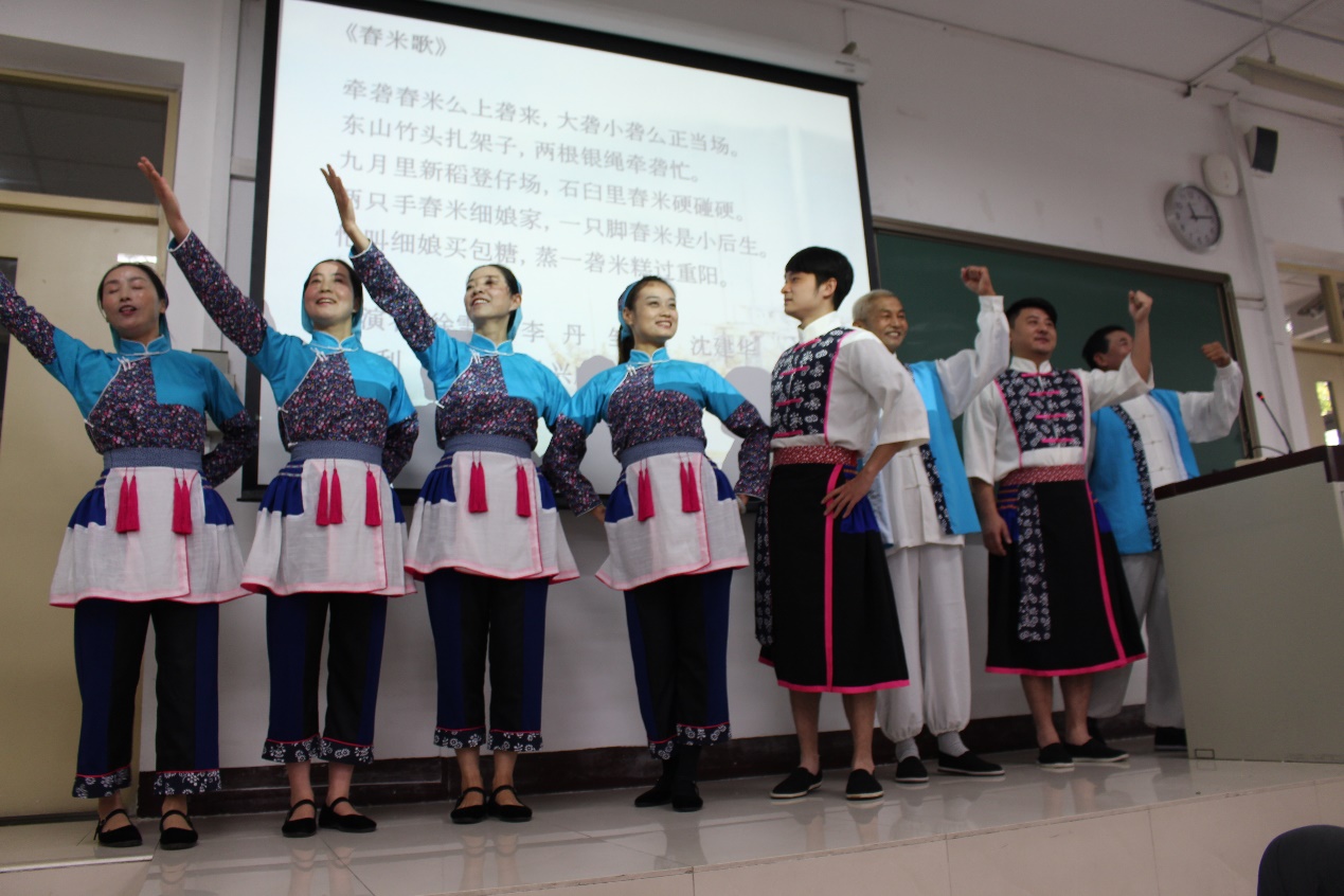 民间文学研究所所长万建中教授的大力支持。 课堂展演首先由常熟市古里镇政府党委副书记顾小燕致辞,她为大家介绍了白茆山歌的基本情况。随后由北京大学陈泳超教授发言,他讲述了从2002年起,一直在白茆村持续开展民间文学调查研究的经历,介绍了白茆的山歌和宝卷等民间文学形式。他引用冯梦龙的“真情民歌观”指出,真情实感是民歌的主要特点,正如冯梦龙所说“但有假诗文,无假山歌”、“借男女之真情,发名教之伪药”。最后,陈泳超教授向同学们提出了希望,他说:“大学生在仰望星空的同时,也要低下头来,聆听来自脚下大地的歌”。陈教授博闻强识又幽默风趣的发言,博得了全体同学的热烈掌声。 江苏省常熟市古里镇党委副书记顾小燕致辞 白茆山歌表演正式开始。歌手们穿着富有江南水乡特色的蓝底花衣,女歌手们还扎上了蓝花头巾,显得素雅而活泼。开场歌曲为合唱《一把芝麻撒上天》,歌手们的歌声中充满了对山歌的爱,高亢辽远的声音让现场观众沉醉不已。歌手邹缨和顾雪华夫妇兼任主持人,他们介绍了白茆山歌的历史及其被列入国家级非物质文化遗产名录的经过。农民歌手们随后表演了情歌、生活歌、劳动歌和改编的新民歌。情歌婉转多变,隽永深情。生活歌表现了江南地区的传统生活,表演者中一位82岁高龄的邹雪英奶奶,演唱盘歌时依然精神抖擞,气势如虹。劳动歌生动形象地表现出人们的劳动生活场景。新改编的民歌则在传统曲调的基础上,增加了现代音乐的范式,如美声、和声和多声部等手法,悠扬动听。 开场歌《一把芝麻撒上天》 邹雪英、丁惠娟母女演唱《盘狮子》 新编民歌《呕哎歌》 演出结束后,进入提问环节。同学们积极参与互动,向各位歌手和老师询问表演服装、盘歌内容、原生态改编和衬字衬词等问题,歌手、组织者和老师们都作出精彩的回答。通过互动,加深了大家对白茆山歌的理解,也提高了同学们对白茆山歌有的探究兴趣。 白茆山歌,是流传在江苏省常熟市白茆塘流域的民间歌谣,是吴地民歌中最杰出的代表之一,至今已有千年以上的历史,被列为首批国家级非物质文化遗产代表作。白茆山歌的内容,包括劳动歌、时政歌、节令歌、地名歌、历史传说歌和情歌等,其中尤以劳动歌和情歌最为丰富和广泛;演唱形式上,不仅有三句头、四句头短歌,也有几十句甚至几百句的叙事长歌。白茆山歌曲调丰富多变,灵活柔丽;旋律典雅古朴,有大山歌、小山歌、四句头、吭吭调、春调、三邀三环、划龙船调、搭凉棚调等几十种,其中最著名的是“三邀三环”,它是白茆独有的山歌曲调。 (撰稿:闫亚楠 岑颖 刘小问;摄影:从恩竹)