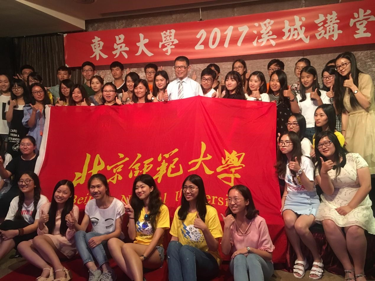的队伍到达台北桃园机场,休整了两天后,东吴大学校方为我们准备了始业典礼。 本次暑期交流项目,同学们选报了三类课群,分别是“鹏飞万里——2017台湾人文采风”、“台湾影剧与流行文化”以及“临溪路70号恋歌——邂逅文学·青春无悔”。三类课群各有特色,以不同的视角来解读台湾的文化,“窥一斑而知全豹”,藉由这三类课群的课程设置,同学们在三周的学习生活中,都能更深入地去体验台湾的人文特色。 本次溪城讲堂的活动还首次邀请到台湾地区前领导人、东吴大学讲座教授马英九先生作为讲座主讲人,在讲座之中,马英九先生重申,“台湾独立”不可行。他更强调应当在承认“九二共识”的基础上,加强两岸经济、文化交流,并希望同学们未来能成为两岸和平交流的使者,推进两岸关系的发展。在讲座内容中,马英九先生表达了对中国传统文化价值的肯定,以及对传统文化的一份温情,以子产之“不毁乡校”来彰显我国传统文化之大有价值。 东吴校方安排“五天四夜青春之旅”,其用意在于让我们更多地体验台湾的多元文化。在这段旅程之中,我们接触了原住民的文化,还进一步了解了日据时期殖民与抗争的最壮烈一幕——“雾社事件”。这是台湾的“山”的精神,“山”的文化的象征。我们见过赛德克族人对祖灵的虔诚。 2017年8月13日星期日上午,在东吴大学外双溪校区普仁堂中,所有课群的学员、东吴国际处的老师以及东吴各大课群的老师、还有带队老师齐聚一堂,参加这最后的结业典礼。 北师大学子的台湾之行至此告一段落,我们会将这份珍贵的记忆留存,并期待着再次相见。
