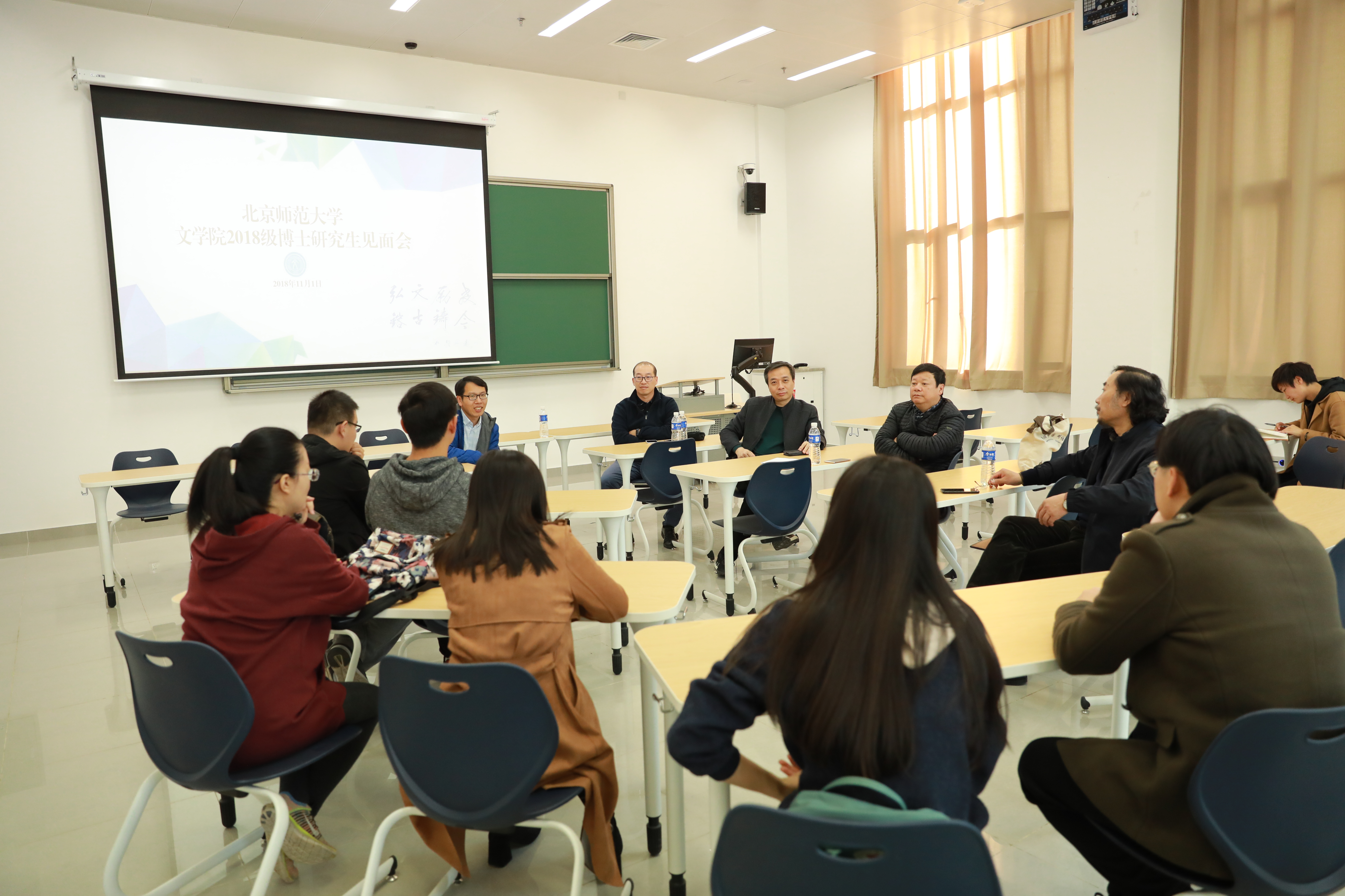 副院长张清华教授,院党委副书记周云磊老师,院长助理、院办主任马然老师,院专职辅导员李晓倩老师和许家敏老师随行参加了见面会。 院领导对2018级博士研究生入学表示欢迎,关切询问同学们在新校区的学习和生活情况,重点了解同学们在上课和学术研究等方面的适应及其与导师沟通的情况。与会学生代表对学院领导和老师们的到来表示感谢,对昌平校区图书馆使用、班车通勤、住宿环境、餐饮商贸、操场使用等学习生活中遇到的问题进行了汇报。学院领导认真听取同学们的诉求和建议,耐心回应同学们的问题,并安排落实有关问题的解决。 最后,院领导和老师们走访了学生宿舍,深入了解同学们的住宿和生活保障情况。康震书记和过常宝院长寄语同学们要勤于锻炼,在新校区潜心学术研究,追求卓越创新。