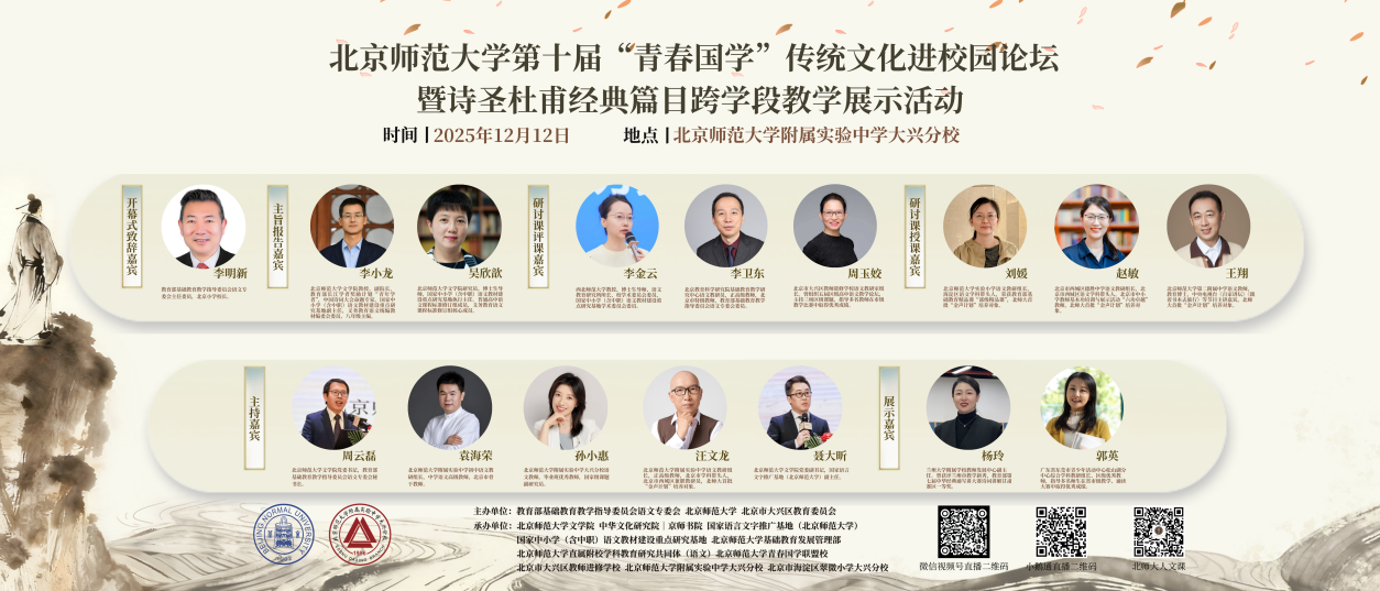 作为百廿学府,始终坚持“学为人师,行为世范”的校训精神,始终秉承着为党育人、为国育才的初心使命,致力于师范教育与传统文化教育相融合。本届论坛将依托学校文史与教师教育积淀,深挖杜甫的新时代育人价值,推动学术资源向教学转化,探索小初高一体化教学体系,为构建高质量基础教育体系贡献北师大智慧。