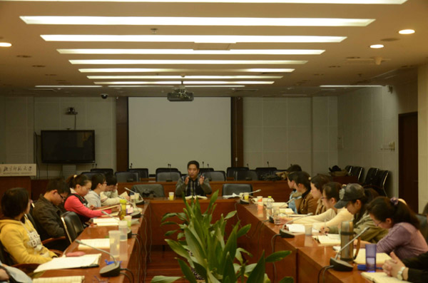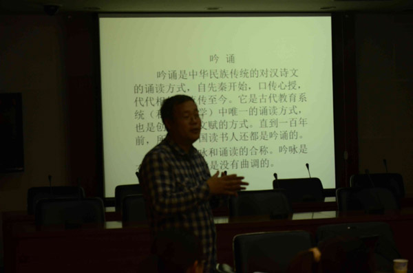 的学生与来自北京大学、中国政法大学、首都师范大学、北京城市学院的同学以及读经会的成员进行了读经活动的体验与交流,互相了解对方学校读经开展情况,气氛十分活跃。在交流过程中,一位头发花白,面色和善的老人尤为引人注意。原来,这位老人是中华诗词吟诵协会的胡天青老师。他听闻“在谦论语读书会”在北师大举行,便赶来参加此次活动,宣传古诗词吟诵。 下午一点半到两点半短短一个小时的时间,胡天青老师给大家讲授了诗词吟诵的基本理论及吟诵技巧。并且充满热情地现场表演了《春晓》、《登鹳雀楼》等大家耳熟能详的诗词吟诵。在座的所有的人被胡老师的热情所感染,纷纷唱和。中场休息过后,赵伯毅老师做了主题为“学懂语言”的演讲,解答了同学们“为什么要素读经典”、“西方辩证哲学和儒家经典的区别”的疑惑。这场演讲使同学们受益匪浅。 下午四点,论语读书会进入尾声,读书会反响热烈,北师大的同学表示很想再次聆听赵伯毅老师的教诲。会后,参加了第55期在谦论语读书会的漫画网站