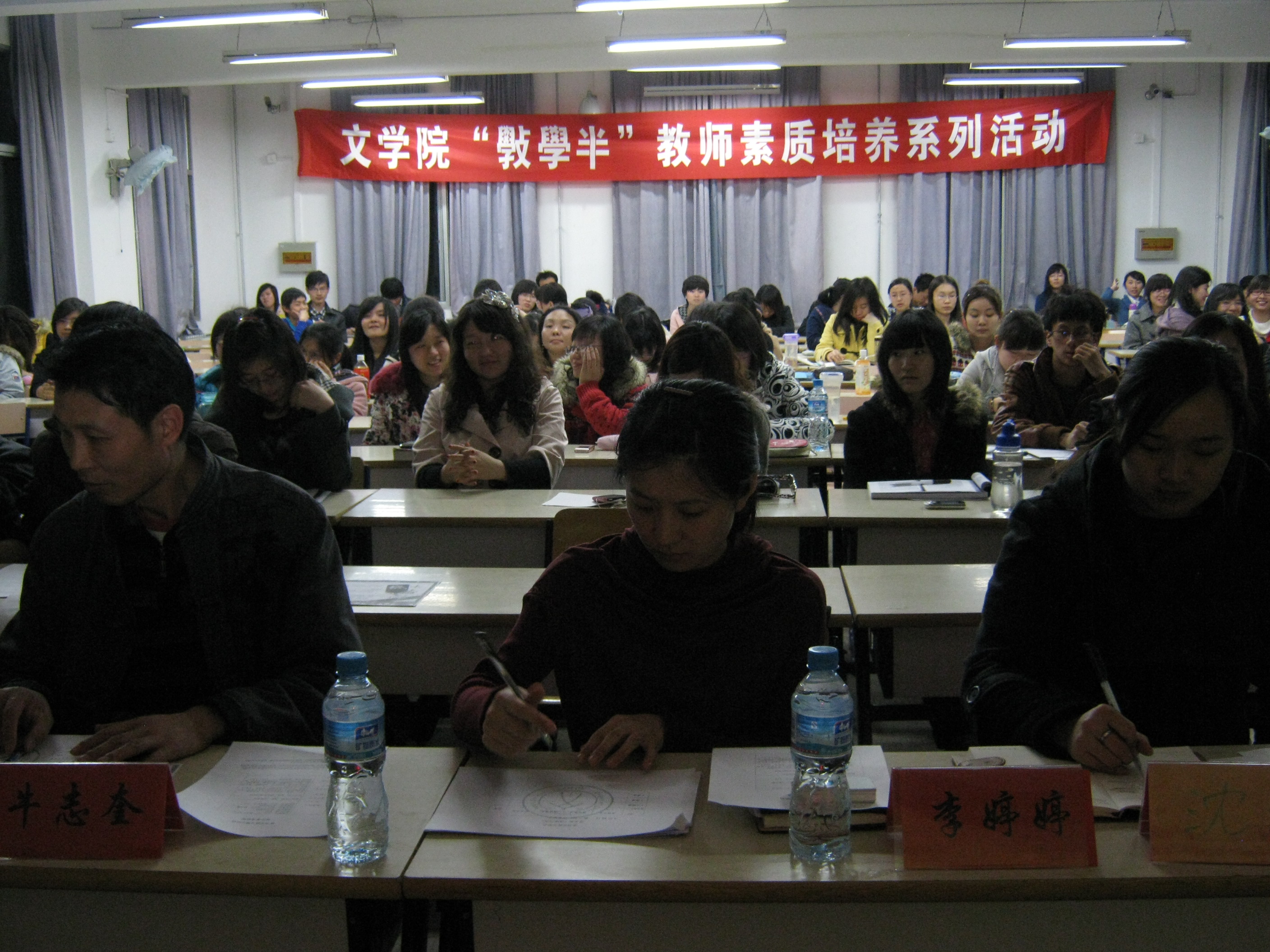 09级汉语言文学两个师范班在教二201共同举办了“读书交流与展示活动”活动。 此次活动中,由每个宿舍各出一个代表来介绍一本好书,这不仅是同学们寒假读书情况的精品展,更是一次分享的聚会。演讲展示按照书籍分成四部分:国学经典、品味当代、外语拾翠、励志人生。在每个环节结束后都由一位评委进行现场点评。在比赛过程中选手们展现出良好的精神风范,能够做到以介绍读书、传播书籍文化为中心。无论是内容、技巧和效果都达到很高的水平,同学们听得津津有味,评委们的点评也契合题意,相当精彩。 此次活动在大家的掌声中圆满落幕,对每一个人都产生了或多或少的影响。 对于组织者与负责人来说,读书交流与展示活动是对他们组织能力、交际能力的一次很好的锻炼和提高。对于参赛选手而言,这次活动提供了上台演讲的机会,让他们在竞赛中锻炼自己的表达能力和体验到竞争的激烈与成就感。即使是普通观众也在这次活动中了解到不少好的书籍,感受到了书籍永恒的魅力。并且能够和老师、评委、同学充分交流,提升了集体荣誉感。