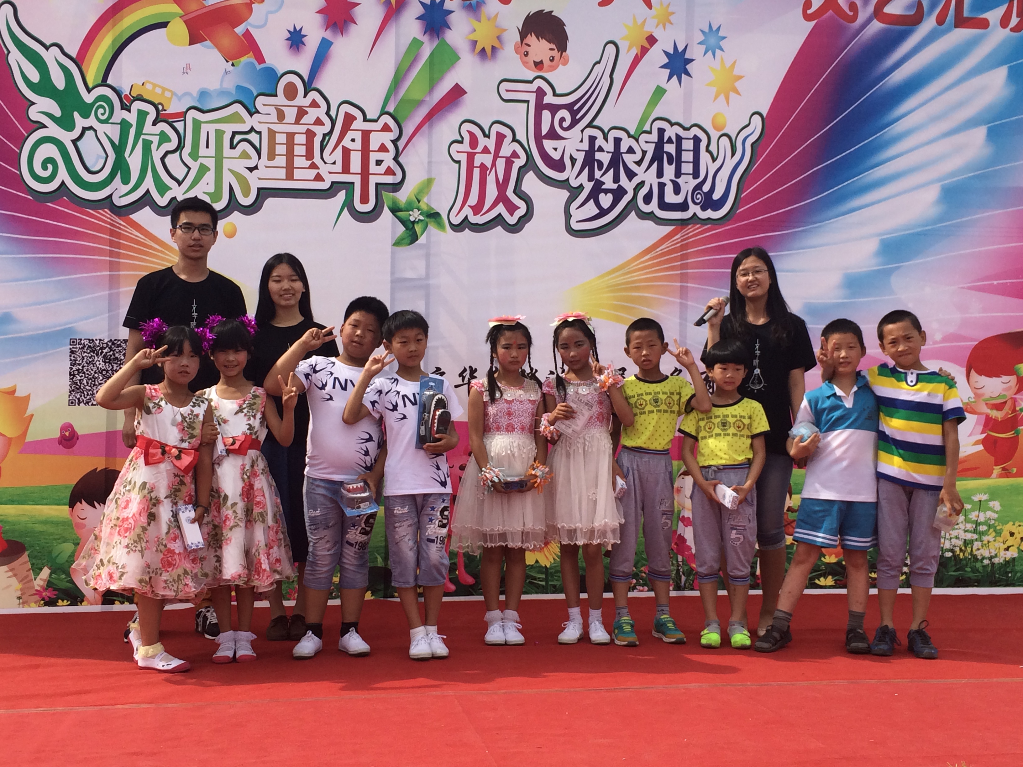 分团委爱心志愿者小分队负责组织演出的互动环节,设计了“你来比划我来猜”的游戏。互动游戏环节调动了孩子们极大的热情,全场三分之二的孩子们都举手参与,最后志愿者从这些热情洋溢的孩子们中选出了六组,进行游戏。考虑到孩子们的年纪和学习程度,志愿者小分队设计了一些贴近孩子生活的词语,如长颈鹿、吃西瓜等,台上参与的孩子们一会儿做出孙悟空张望的动作,一会儿又做出大口吃西瓜的动作,按照卡片上给出的文字模仿得惟妙惟肖,带动了全场的气氛。
