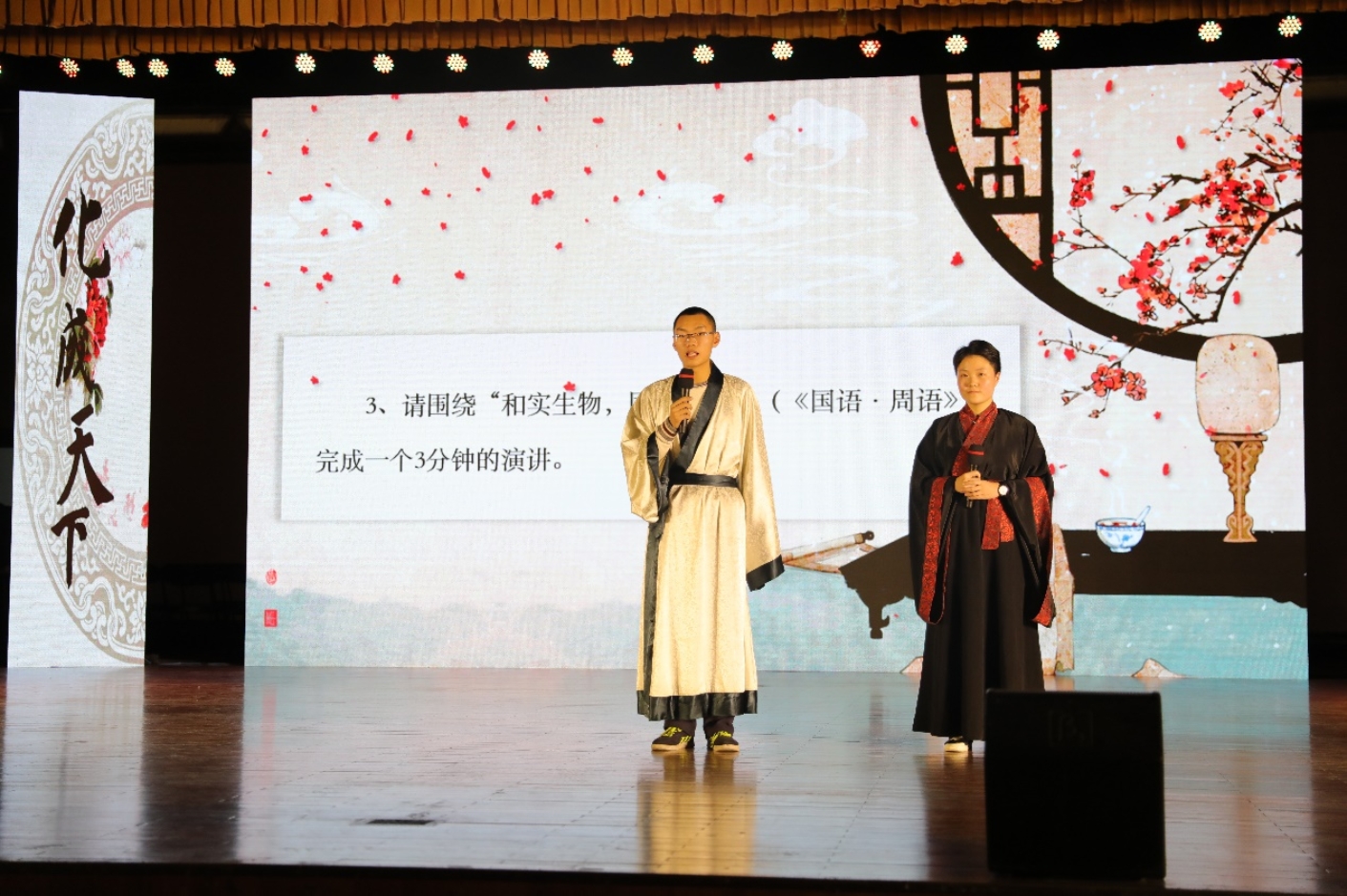 副校长涂清云教授致欢迎辞,他介绍了我校的基本情况,对我校十年来参与北京市大学生人文知识竞赛的情况作了总结。他代表学校诚挚地欢迎参加比赛的选手、老师和评委,希望各校选手能够以文会友,在比赛中取得理想成绩。中央民族大学党委副书记李计勇、中国青年出版总社副总编辑蔺玉红分别代表组委会和主办方致辞。 我校选手进行知识问答 随后,比赛正式开始。在古诗创作及誊抄环节,各校选手伴随悠悠古琴音以《溪山行旅图》(范钟)为依据进行创作。北师大代表队的同学们在十五分钟内完成了一首格律严谨、境界开阔的《题溪山行旅图》的七言律诗,对画面意境作出诗意的阐释,尤其“分付秋心向晚洲”的结句获得了评委的一致赞赏。 第二环节知识问答分为必答题和抢答题,我校选手分别在两个题型中获得115分和15分,皆为最高分,展现了我校学子从容不迫的气魄与深厚的人文素养。 我校选手进行现场演讲 第三环节现场演讲,各代表队抽签获得对应的题目,并派1-2名队员上台演讲。各高校的选手们在获得题目短短五分钟后便登台演讲,引经据典、声情并茂、文采斐然。北师大代表队的徐佳炘、闫淑一围绕《国语·周语》“和实生物,同则不继”一句话展开了精彩的论述。他们将“和”定义为多元多样共生的状态,“同”定义为消泯了多样性只追求形式的一致。只有“不同”,这样才能促进事物之间的交流碰撞,世界才有生机活力。整个演讲论述清晰,语言流畅,获得评委好评。 我校选手进行人文演绎表演 现场选手演绎 第四环节人文演绎,主题为和合之道或中外科学家及其时代。各高校代表队紧密围绕主题编排节目,精心选取历史元素,鲜活再现了杰出历史人物的可贵品质,为现场观众呈现了一出兼具深度与表现力的人文戏剧盛宴,充分展现了当代大学生的创新精神和青春活力。我校代表队的《灯塔》聚焦于理性的坚守,以中世纪前夜的亚历山大为背景,通过对女数学家希帕蒂亚生命的最后时刻的演绎,探讨了科学与信仰的关系,讴歌了理性的可贵,引发了在场观众的强烈共鸣。 我校选手进行古诗创作展示 最后一个环节为古诗创作展示,每队选派一名队员朗读本队创作的古体诗,同时在大屏幕上显示。我校选手所创作的《题溪山行旅图》以精准的立意、正确的平仄及典雅的用词获得了评委们的高度评价。 南山诗社诗词吟唱表演 此外,我校南山诗社作为特殊环节的表演嘉宾为全场观众带来了古典诗词吟唱《客至》与《定风波》两支曲目,在比赛之余,带领选手与观众们在歌声中领略古诗词的音韵之美。 选手合影 观乎人文,化成天下,2019年“青年杯”北京市大学生人文知识竞赛在观众们热烈的掌声和欢呼声中落下帷幕。我校学子以决赛一等奖第一名的成绩为此次大赛画上一个圆满的句点,展现了北师学子深厚的人文知识素养和青春昂扬的精神风貌。以文会友,以友辅仁,人文知识竞赛的精神也将继续传承与发扬。