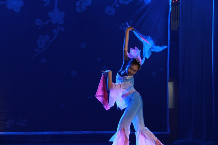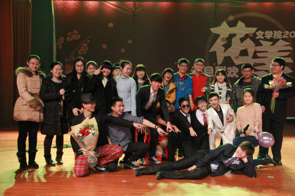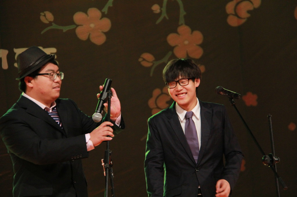 下午三点,晚会准时开始。开场的摇滚一如既往的动感愉悦,伴随音乐声,观众渐渐入场。本次晚会的主持人中有来自韩国的2011级学员李相奎,另外三位则分别是来自大一的张祎昀,常晋和赵天一。主持人们一改往日严肃的风格,以诙谐轻松的对话介绍晚会的形式,博得阵阵笑声。这次晚会的形式也与往年有所不同,全场的节目被分为了红蓝两队,以擂台形式一决高下,最终通过观众投票等方式决出优胜队伍颁发奖杯。