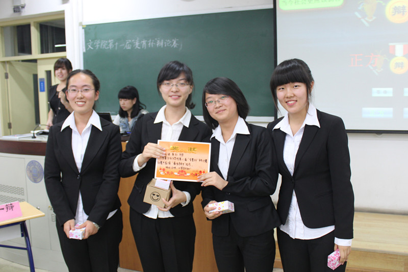 辩论队队长刘佳音、2011级法学院辩论队队长焦璐斐以及四班辅导员位聪聪担任评委。参加此次辩论赛的选手分别来自汉语言一班、汉语言三班和传播学四班。