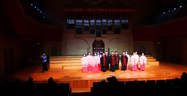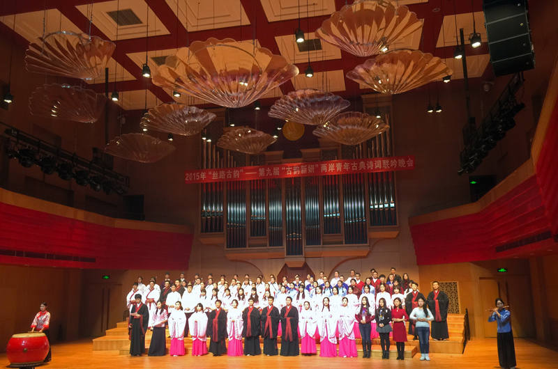 珠海分校沧海诗社、西北师范大学子衿诗社、邯郸学院学步诗社和新疆财经大学昆仑诗社参加了联吟表演。中南大学吟诵团则进行了观摩学习。 “丝绸之路”是指起始于古代中国,连接亚洲、非洲和欧洲的古代路上商业贸易路线,距今已有2000多年的历史。2013年习近平主席提出建设“一带一路”的战略构想,为世界和平发展增添新的正能量。本次联吟大会以“丝路古韵”为主题,以优美的吟唱,恭谨的礼仪,真挚的情感,带领大家穿越时间与空间,领略了传统文化的魅力。 晚会以东道主南山诗社吟唱的朱元璋的《念以宁涉江海》开场,分“送水别杨” 、“越海横关” 、“高歌慢曲”、“浅诉深衷”和“汉家山月”五个板块,分别从海与陆、东与西两线出发,贯穿了《长安杂题》、《渭城曲》、《蒹葭》等诗词名篇,最后以全体高歌传统曲目诗经《蓼莪》结束,一曲终了,眼中带泪。