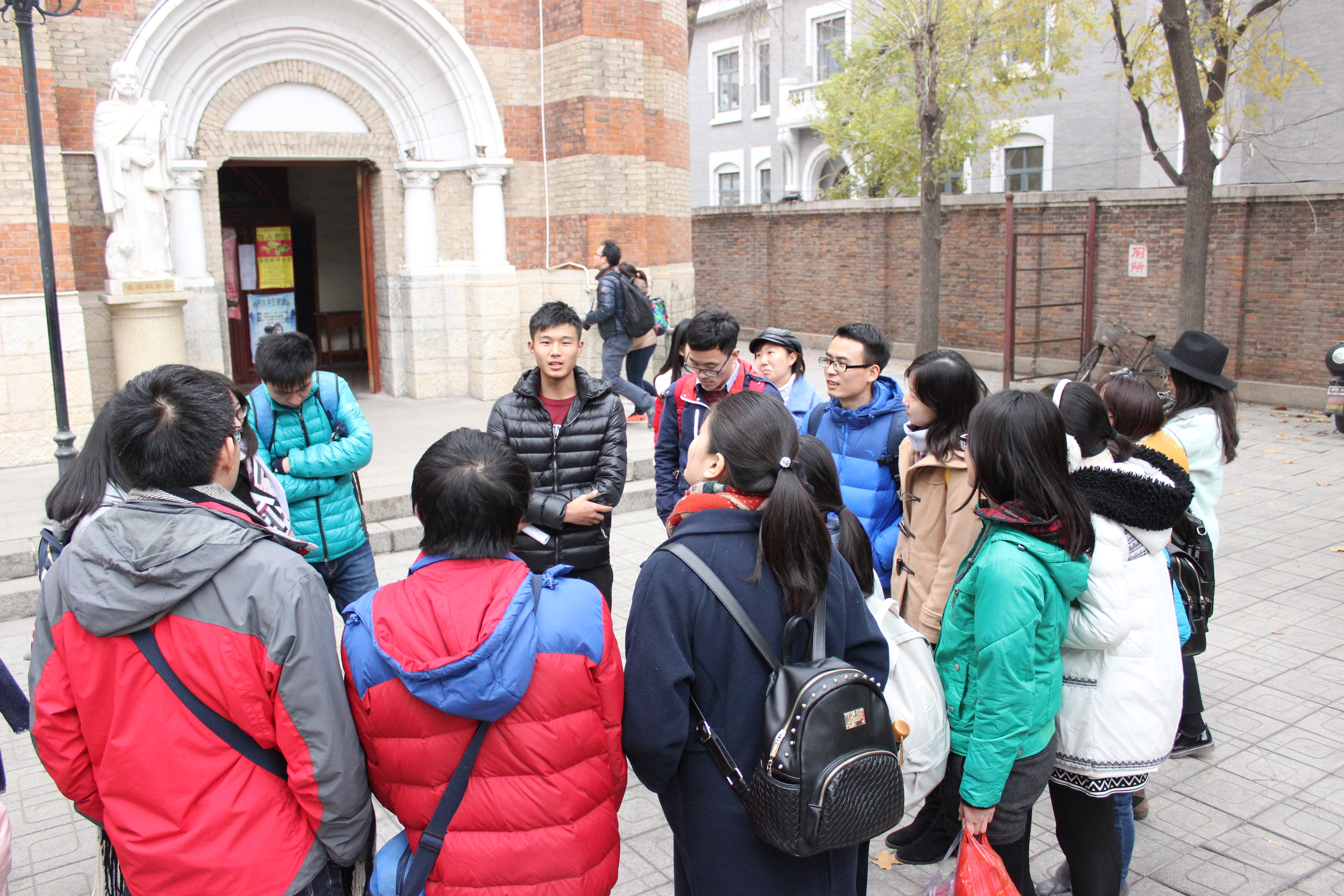 学生会的同学向我们讲解介绍西开教堂。西开教堂建筑风格属于罗曼式,主体是用红黄色花砖砌造的,教堂内有许多壁画和大管风琴,前面院中有圣水坛,有左右两道大门,信徒分男女从不同的门入内。西开教堂的结构是带厢堂长殿式,教堂横殿和长方形教堂相交构成十字连拱廊。室内八角形的穹窿顶及侧窗均以彩色玻璃嵌作画。内墙彩绘壁画,装饰华丽,充满宗教神秘气息。
