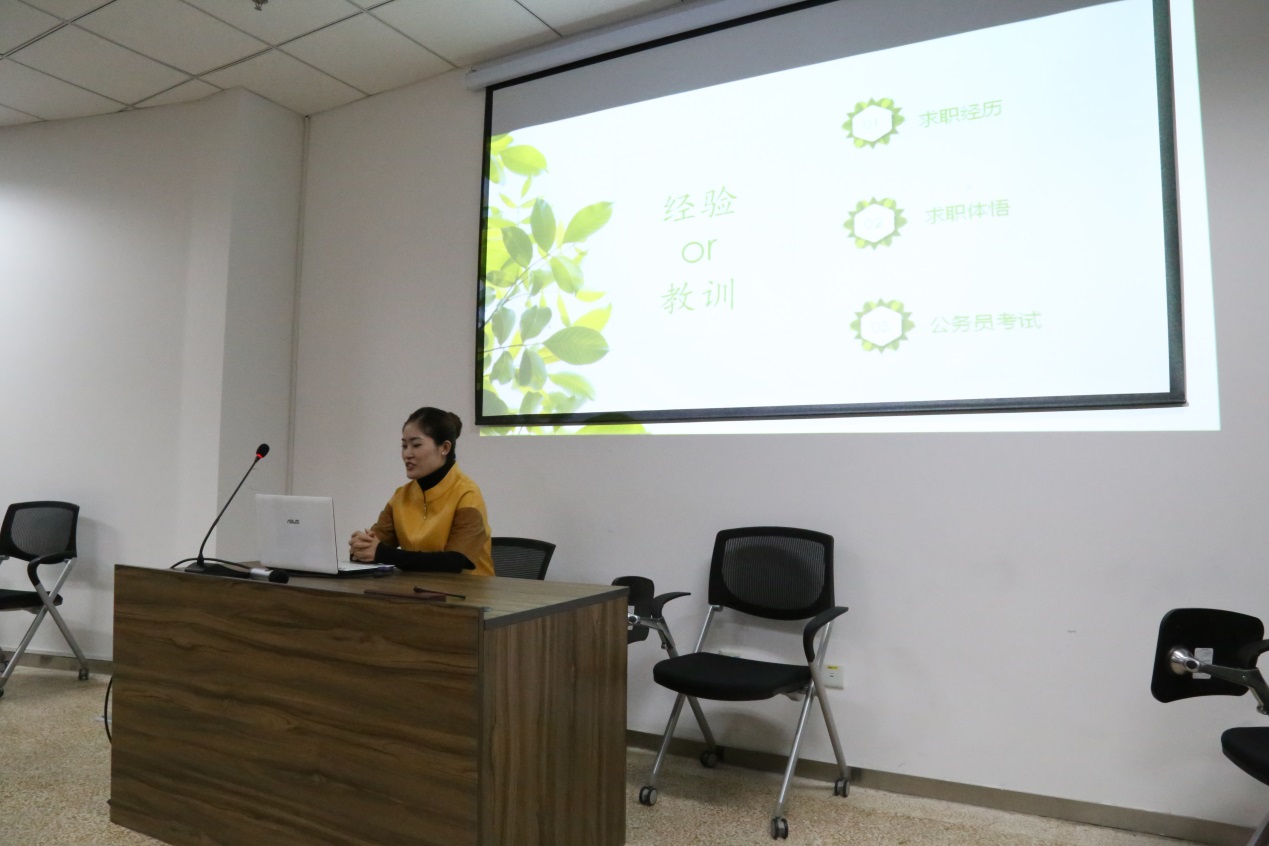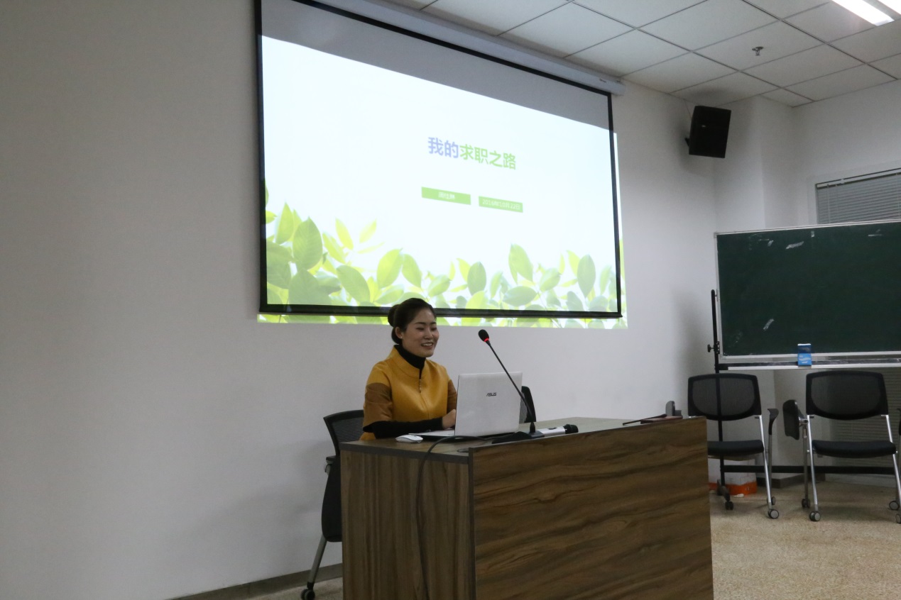 接下来师姐通过回答同学们的提问来分享自己找工作的经验,详细介绍了如何在简历上体现自己的能力、高校辅导员的招考流程、如何进行职业规划、在找工作过程中怎样保持良好的心态等同学们都非常关心的问题,现场气氛达到了第一个小高潮。