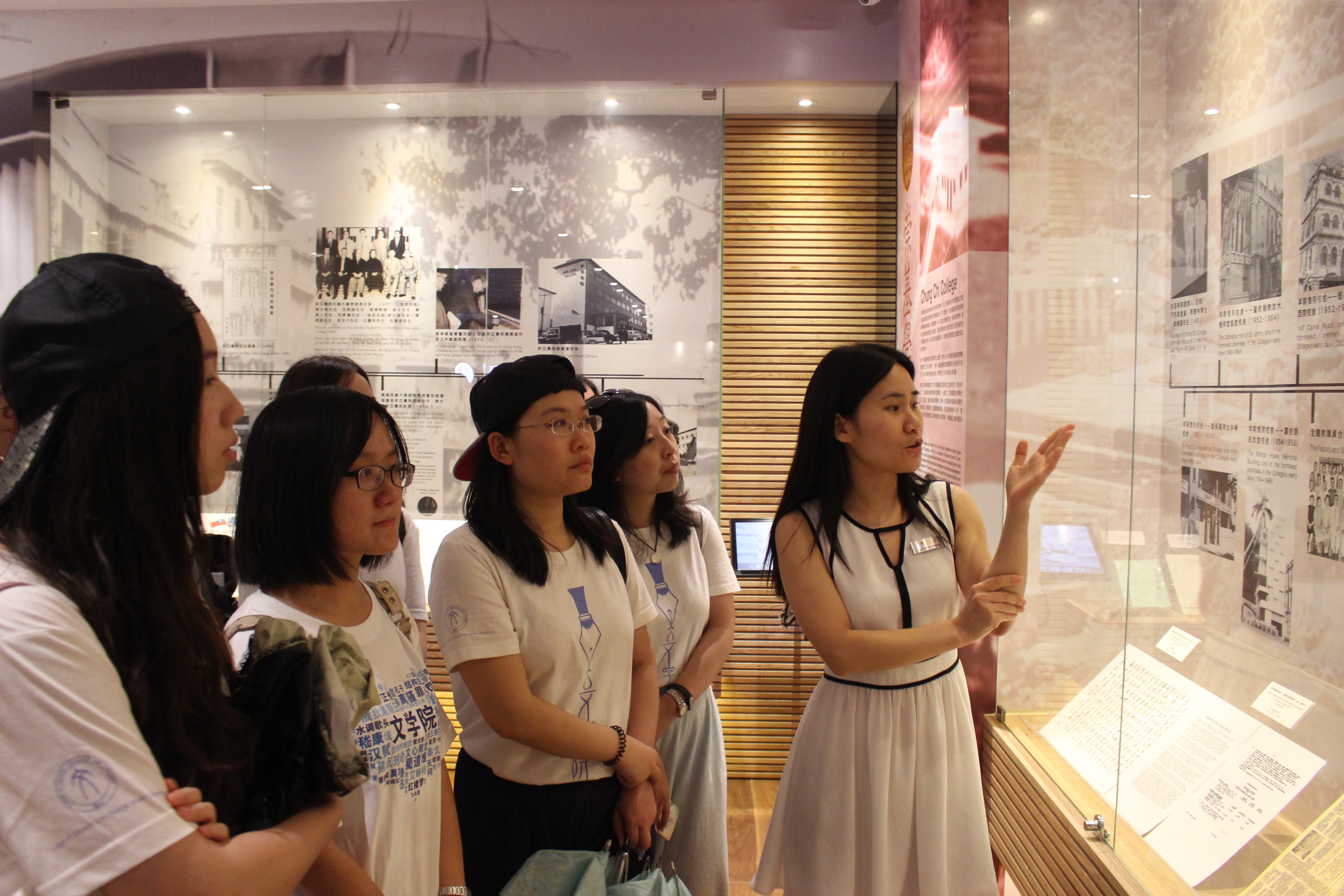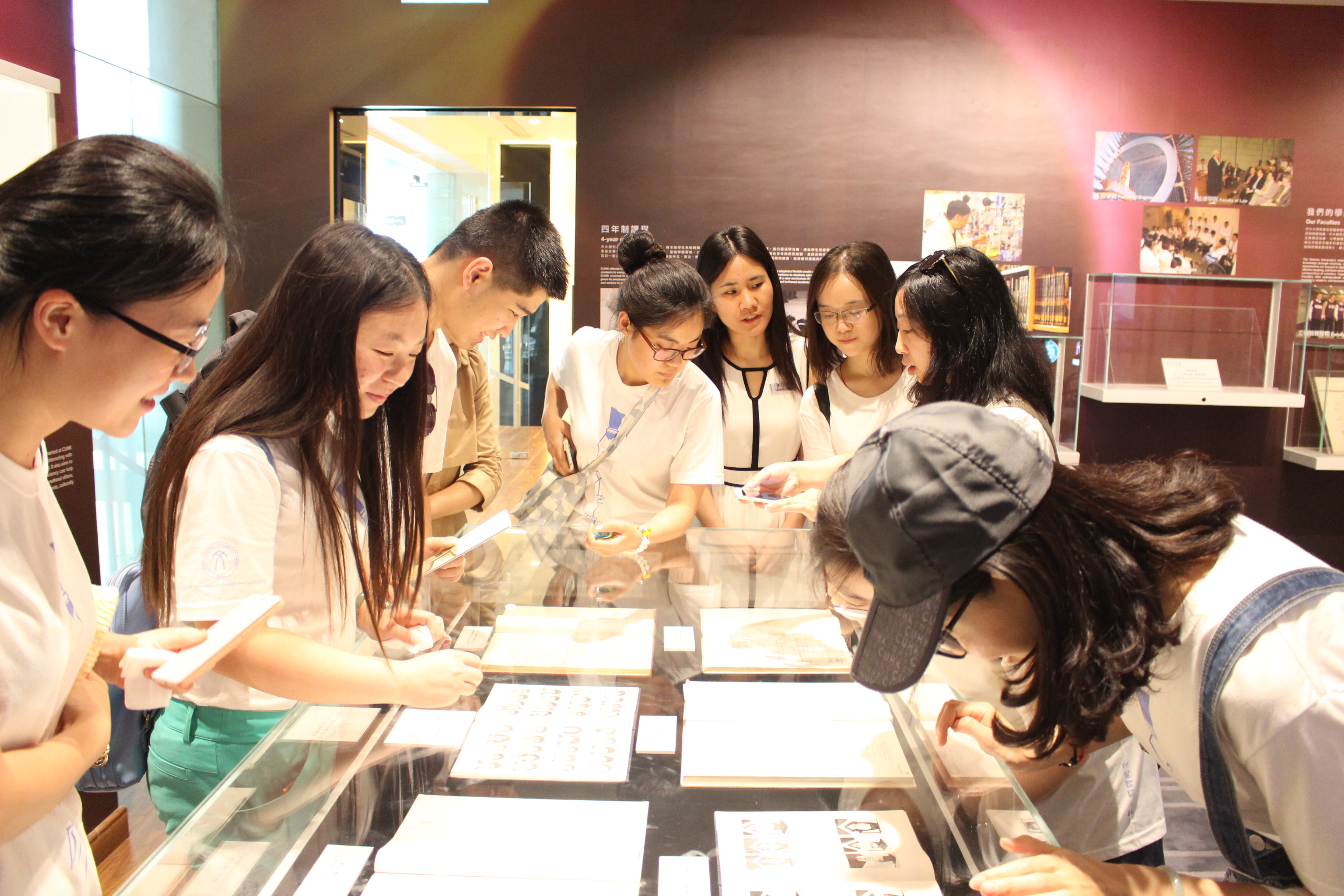 当天下午,同学们赴香港中文大学参观。港中大校园依山而建,教学楼错落有致,草木繁茂。同学们重点参观了图书馆。在图书馆的展览区,展列着港中大的发展历史,通过相关老师的讲解,港中大的发展脉络清晰地浮现在大家眼前。之后,在图书馆工作人员的带领下,先后参观了24小时自习区、研讨室以及藏书区等区域。24小时自习区里的墙上留存着许多学生写下的诗句及座右铭,或俏皮、或成熟,彰显着港中大年轻人的青春风采;一楼的展区正在展列着与道教相关典藏书籍,功夫熊猫与道长形象结合的引导牌展露出中大人的创意;藏书区藏书丰富,让人目不暇接;许多手写的硕士毕业论文,则凸显了港中大学生严谨、认真的学习态度与勤奋好学的学习氛围。