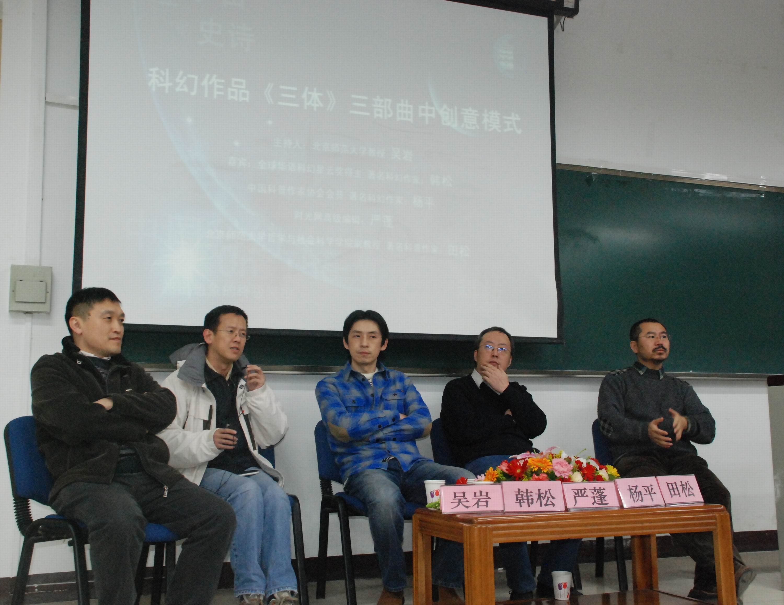 教二101教室举行。到场的嘉宾有著名科幻作家韩松、杨平,时光网高级编辑、著名影评人严蓬,北师大哲学与社会学学院副教授田松等人。在北师大教育学部教授、科幻研究者吴岩老师的主持下,与会嘉宾妙语连珠,各自从不同的视角提出了自己的精辟见解。 在两个半小时的论坛活动中,嘉宾与听众各抒意见,天文、物理、生物、伦理、宗教等多个学科的思想在此交锋,为《三体》三部曲这部伟大的作品提供了更多阐释的可能。最后,论坛在与会全体人员意犹未尽中圆满结束。