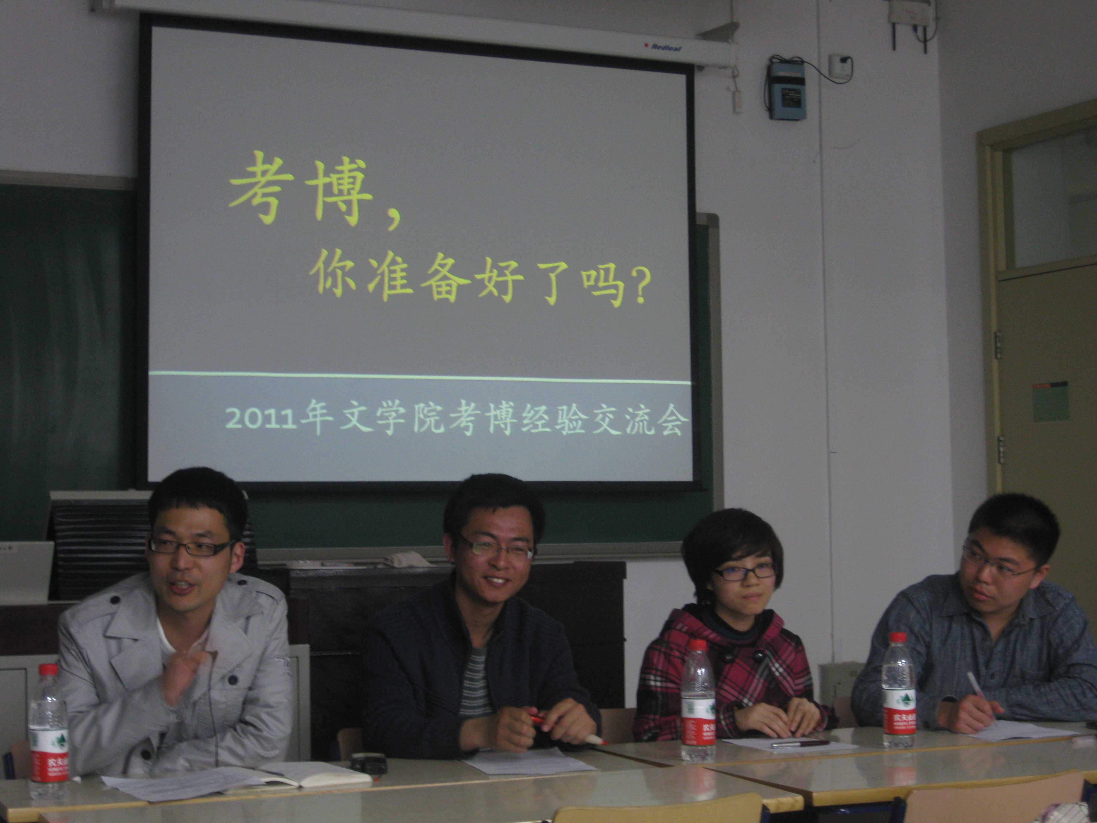 研究生会学术部主办,邀请到文艺学专业的唐卫萍、语言学专业的张东赞以及现当代文学专业的朱永富等三位在读博士生与同学们交流和分享考博经验。