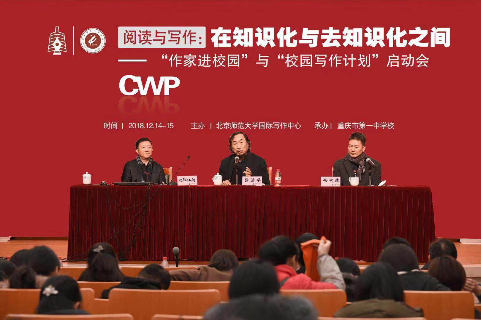 国际写作中心校园写作计划的种子学校以来,通过开展作家进校园、文学研讨等系列活动,取得了喜人的育人成果。”沙坪坝区委常委、区委教育工委书记、区教委主任蔡道静在讲话中表示,“重庆一中承办此次活动,既体现了一中作为全市基础教育领军学校的引领和担当,也是业界和社会对一中办学成果的肯定和认可。” 国际写作中心执行主任张清华教授阐述了活动主题,文学是丰富的,与世界的千变万化是匹配的,在知识化和去知识化之间,需要辩证地处理两者关系。语文教育,文学教育,归根到底是一种百科全书教育,是一种思想的、人格的、品德的教育。有效的教育,应该是一种启发式的,把书本的知识教育和生命人格实践的启迪和教养养成联系起来。 在本次活动中,毕飞宇、欧阳江河、李洱、丛治辰和余党绪发表了主旨演讲,从不同角度阐述如何寻找“去知识化”的途径,为大家分享了鲜活的文学创作经验。 名家分享:师生共享精神大餐 作家学者为高中学生开展了对话和演讲。 14日上午,作家乔叶、宋潇凌与高二学生畅谈“在阅读与写作中如何审察世界”。针对“审察”这一议题,两位作家从“认识这个世界”着手,认为中学生应该从认识自己、认识家人、认识文学经典并多读书三个途径,来提升对世界的认知。 14日下午,作家张者、毕飞宇与师生对话“如何从观察进入写作”。作家张者建议高一的同学们要多读当代文学的中短篇小说集,并把这个阅读变为经常性的。在张者看来,“光有阅读还不行,要培养隐密写作,即学生写出的东西不给家长和老师看,可以天马行空地写,津津有味地写,这对写作提高有帮助。”在与高三学生对话中,作家毕飞宇专程写了一万多字的讲稿,以“远古的劝说”为题,从《养生主》里的“庖丁解牛”入手,从刀到庖丁再到梁惠王,层层解读庄子剥洋葱式的写作方法,并由此引出中国文化里的隐形逻辑。毕飞宇表示,“隐形逻辑其实就是兴和比,兴是先言它物而言其所有叫兴,比则是以它物比此物。大家在写作时尤其要注意中国文化中的隐形逻辑。” 15日上午,作家乔叶、青年评论家丛治辰、诗人欧阳江河、作家宋潇凌围绕如何解读文本、如何实现文学化表达等议题,分别与高三年级大学城校区、奥赛学生开展了精彩的对话和交流。同学们踊跃参与,争相与作家对话。每场讲座将近两个小时,同学们沉醉其中,意犹未尽。演讲结束后,同学们依依不舍,久久不愿离去,继续到舞台中央提问,作家们都侧耳聆听,耐心地回答了重庆一中学生的各种问题。“我们如同作家们的一群孩子,是一群开心地、想要汲取更多知识的孩子”,高二年级2班的一位学生说道。 论道:研讨碰撞思维之花 相比“名家分享”的智慧传递,在图书馆学术报告厅举行的“文学研讨”则更显“激情澎湃”。在为期一天半的活动中,借助文本解读、沙龙对谈、主题研讨等方式,作家、学者们与参会师生,互动交流,思想碰撞。 14日下午,重庆一中高中语文教研组长安磊、青年评论家丛治辰、语文特级教师余党绪、作家李洱依次就“沈从文《生》和川端康成《面貌》”两篇文本从不同角度进行文本解读,并以此为基础,深入讨论了文学教育的深层次的问题,整场讨论弥漫着思想和智慧的火花。 “文学如何走进学生心灵?”这是不少教师困惑的难题。在沙龙对谈环节,张清华教授、诗人欧阳江河、语文特级教师余党绪老师围绕这一难题展开讨论。张清华认为,“作为执教者,应该正确把握文学的尺度,把它变得更宽、更柔,更真实,更负责,走入孩子的心灵。”欧阳江河则引用叶圣陶先生的“我手写我心”的名言,从阅读和写作两大板块着手,给执教者带来深度一课。余党绪则从一线中学教师的角度,为大家传授经验。他说,“在学生不具备独立的拥抱文学经典的背景下,老师们需要提供路径、房子、支架搀扶孩子们走进,这是中小学老师的重任。” 15日上午,张清华教授、诗人欧阳江河、作家张者、中国教育报校长周刊主编齐林泉就“如何让写作获得质的提升”与重庆一中师生展开主题研讨,初二学生代表刘牧原、高三学生代表王文对阅读的困惑、阅读的反思等问题提出自己的看法;语文教师代表苟瀚心就语文文学教学、如何指导学生积累等问题发出疑问及青年教师的看法。四位专家、学者就这些问题作了精到而深刻的回答,生动的叙述让师生们深受启发。 校园写作计划:让文学生根发芽 12月15 日,由北师大国际写作中心和重庆市第一中学校共同发起的“校园写作计划”启动会在学术报告厅举行。北师大国际写作中心执行主任张清华教授,著名诗人、漫画网站