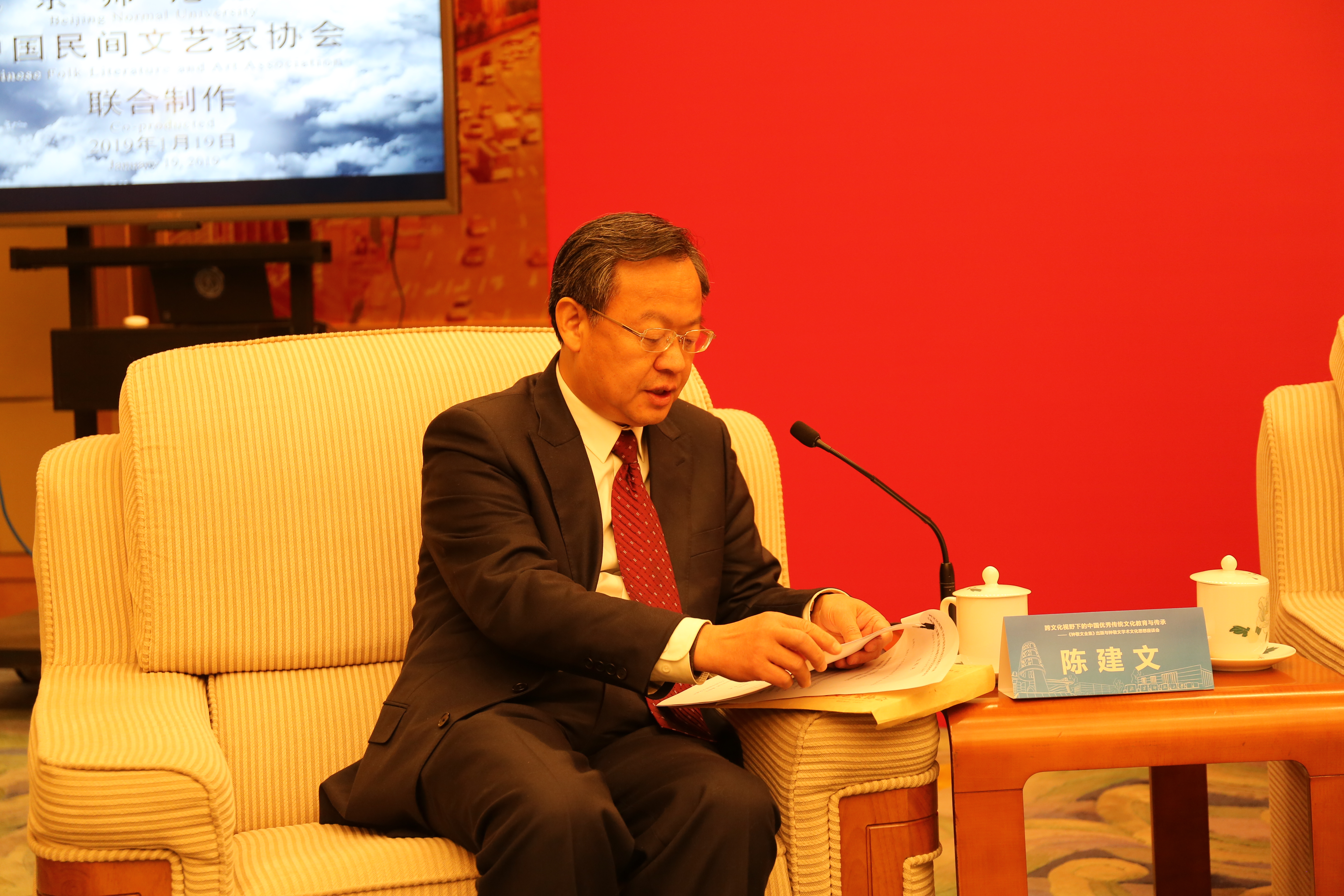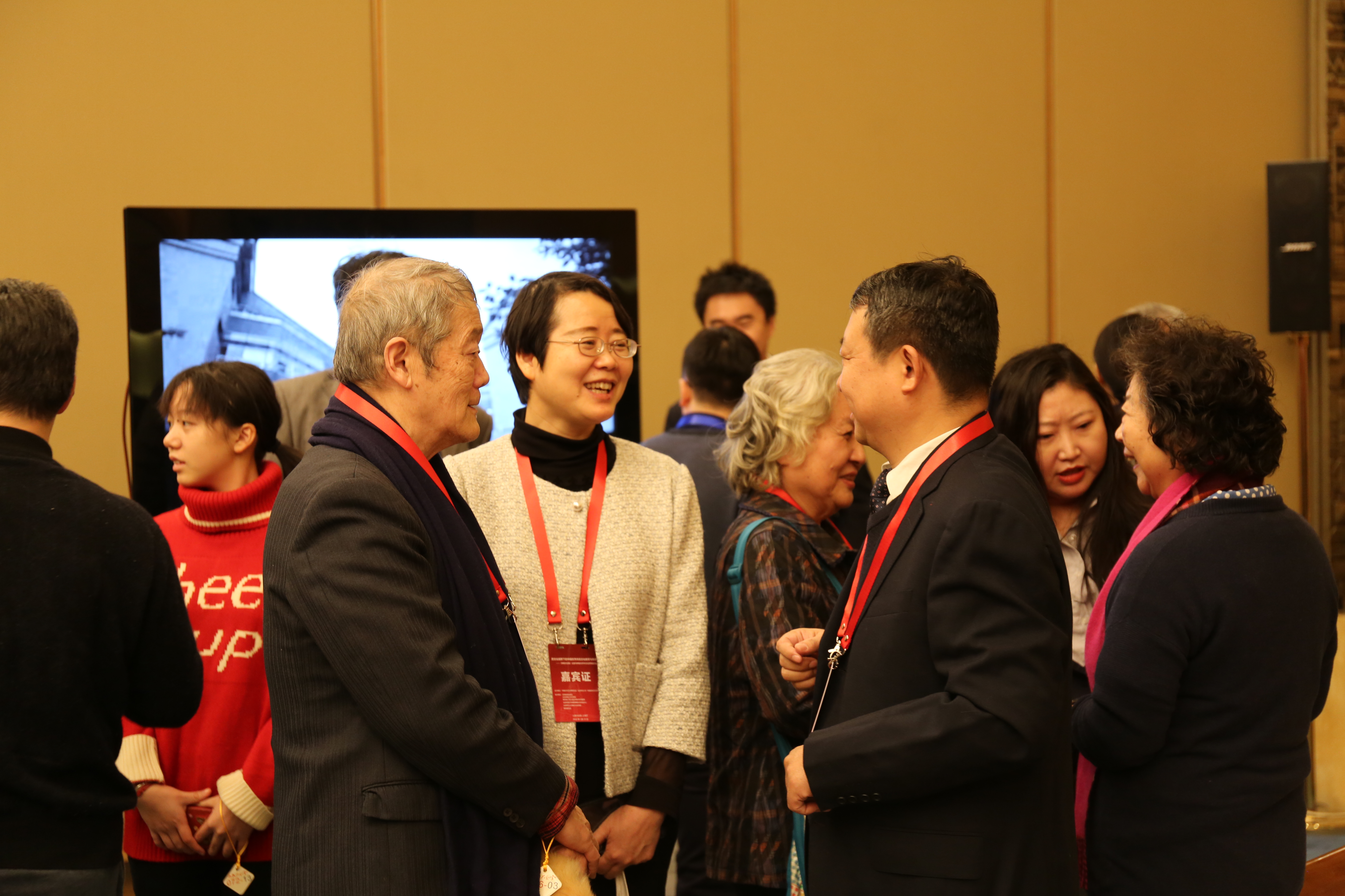 王宁先生(左)在交谈(曹文瀚摄) 高教社领导与《钟敬文全集》部分编委合影(右起:湯悦、乐黛云、苏雨恒、张恩和、王宁)(曹文瀚摄) 钟敬文先生亲属与弟子等合影(曹文瀚摄) 与会部分学者合影(右起:王一川、王宁、董晓萍、杨共乐)(曹文瀚摄) 北师大文学院院长过常宝教授(左)与北京大学艺术学院院长王一川教授(右)交谈(曹文瀚摄) 北师大文学院副院长杨利慧教授(左四)与钟敬文先亲属和学者交谈(曹文瀚摄)