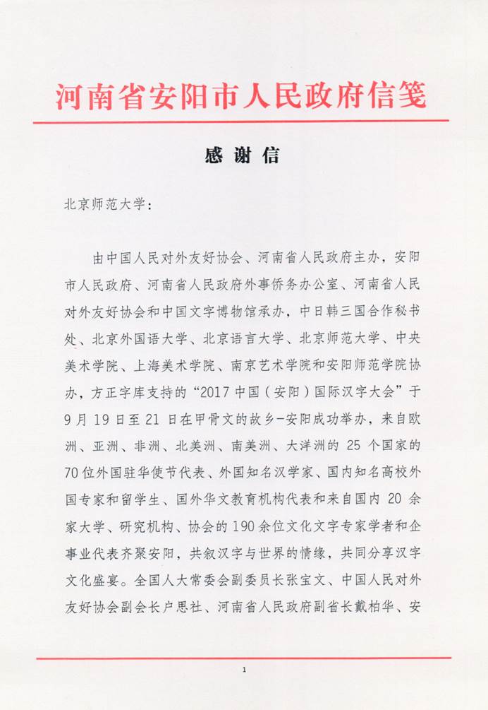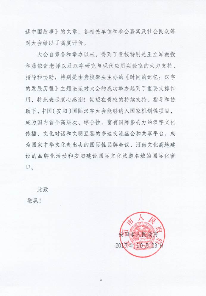 汉字研究与现代应用实验室王立军教授等对“2017中国(安阳)国际汉字大会”的大力支持、指导和协助。来信高度评价了由漫画网站