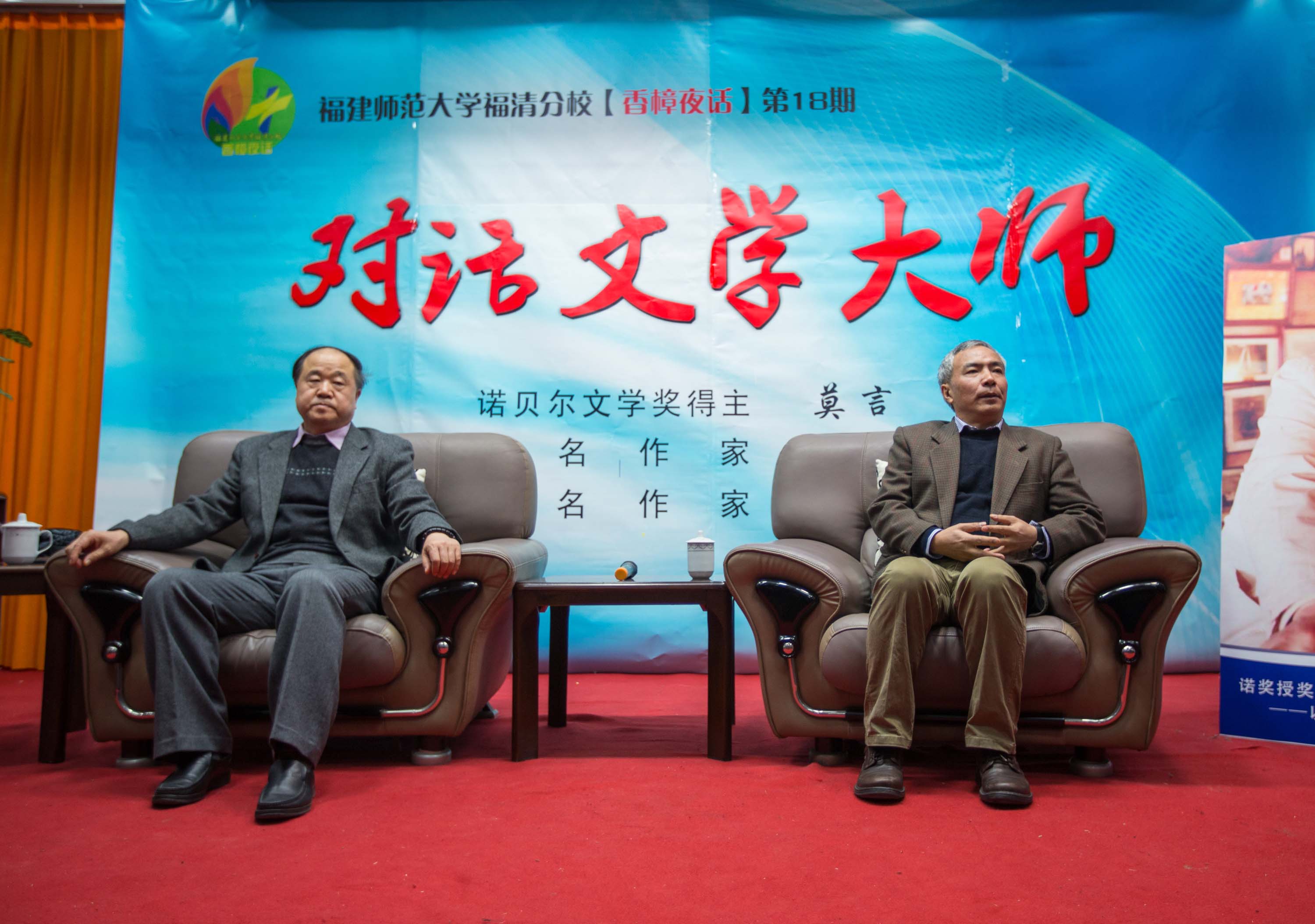 副院长张清华主持,福清市文学爱好者十分踊跃,现场参加人数达1000多人。三位作家就中国故事与作家记忆、中国故事的国际表达进行了精辟的讲述,并与现场观众进行热情互动。当晚,莫言、格非一行又在福建师范大学福清分校进行“对话文学大师”的现场交流,在校师生对两位文学大师到来十分欣喜,面对学生热情的发问,莫言鼓励大学生说,人所经历的一切都会成为文学的素材,对所有尝试文学创作的人来说,都有机会。两位文学大师平易近人,妙语连珠,现场气氛极为火爆。