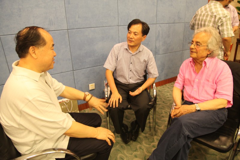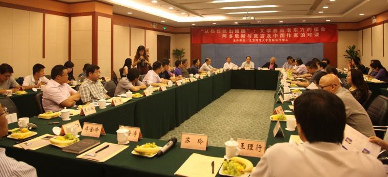 京师学堂举行。此次对谈的主角为来自叙利亚的著名诗人阿多尼斯和北师大国际写作中心主任、著名作家莫言,除此之外,格非、李洱、西川、欧阳江河、王家新、薛庆国、吴思敬、唐晓渡、王宁、田原、树才、高兴、阎晶明、骆英、邱华栋、周庆荣、潇潇、林丰民、张柠、张桃洲等一批著名的诗人、作家、翻译家及评论家参与了对谈。北师大副校长、著名学者曹卫东教授,北师大资深教授、著名学者童庆炳先生、北师大国际写作中心执行主任张清华、副主任梁振华也一并出席了活动。