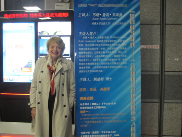 及比较文学与世界文学研究所邀请哈佛大学苏姗•苏莱曼教授,成功举办了主题为“别样的文学史——二战期间及战后法国犹太人的身份问题”的讲座。主讲人苏姗•鲁宾•苏莱曼博士(Susan Rubin Suleiman)是哈佛大学法国文学、比较文学教授,曾任哈佛大学女性研究委员会前主任,研究领域主要是法国文学、性别、文化研究等。苏莱曼教授著述颇丰,主要著作有《不良意图:性别、政治与前卫派》、《布达佩斯日记》,编著有《流放与创造性》、《西方文化中的女性身体》等。她曾获得过古根海姆基金、洛克菲勒人文基金以及NEH基金等荣誉,之前曾担任过现代语言学会委员以及美国比较文学协会的主席。苏莱曼教授此次来华讲座包含两个专题和一次讨论,由姚建斌博士主持。