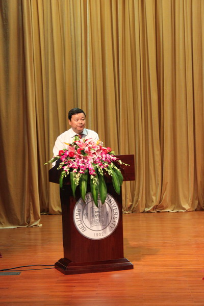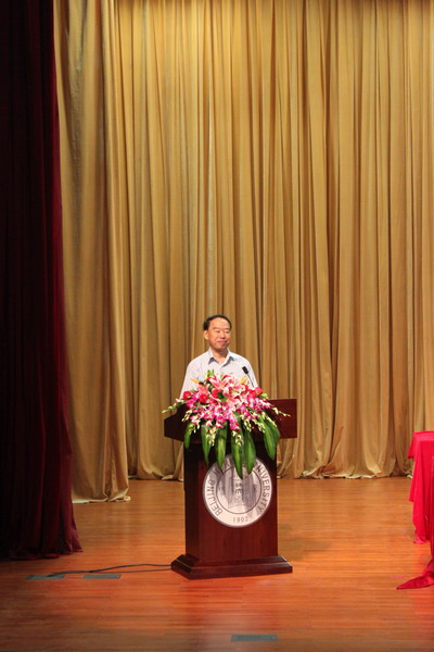 需要你们!”童先生的亲切呼唤赢得了在场同学的一片掌声。他结合自己丰富的人生阅历,为新生提出了“求真”、“求善”、“求美”的为学做人之道,希望同学们在多元复杂意识形态的冲击下坚守自己的原则。随后,从刘勰“情以物兴,物以情观”的美学观点切入,童先生深入浅出地为新生们揭示了“情物互构”,“读万卷书亦应行万里路”的道理。最后他寄语新生,“走好自己的路,实现人生的升华。”童庆炳先生的发言引发了同学们深入思考和强烈共鸣。