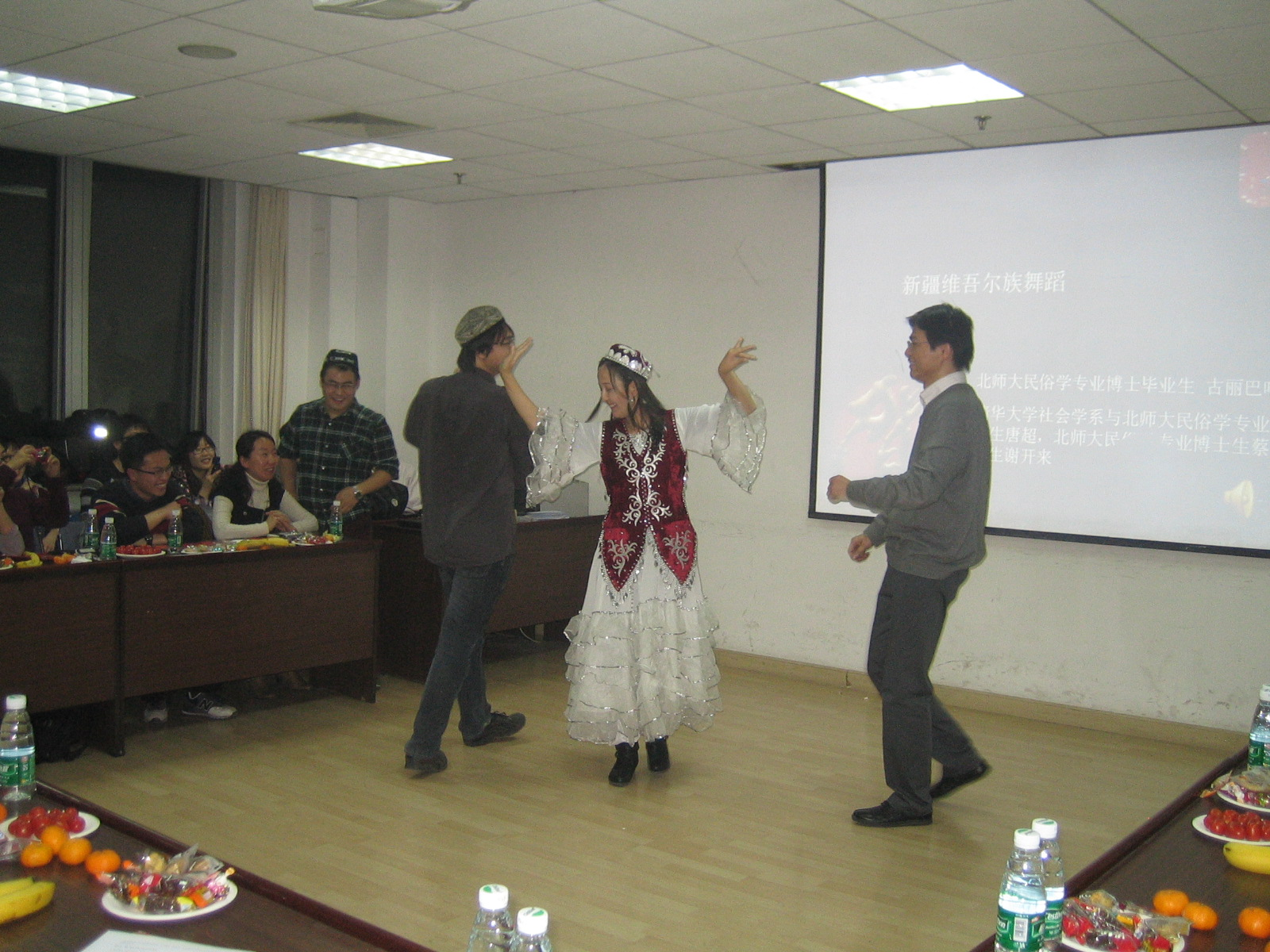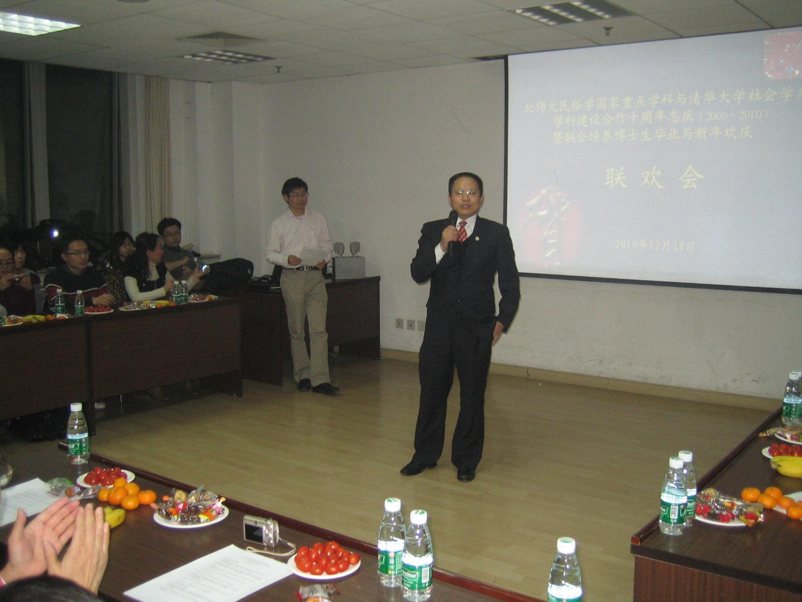 副院长姚建彬博士代表院领导出席会议并致辞,他在讲话中,对清华大学社会学系和北师大民俗学国家重点合作开展教学和高级人才培养工作,给予充分肯定,希望双方进一步整合校际优势资源,积极创新开拓。清华大学人文社会科学学院院长李强教授即席讲话,他深情地回忆了钟敬文先生的生前嘱托,认为两学科合作的目标,就是要认认真真地继承前辈大师爱国重教的学术传统,踏踏实实地建设学科,真正培养出一些有利于国家社会建设和学术发展的有用人才,他还对新时期博士生人才的特点做了高度概括,对十年合作的成绩做了扼要总结。北师大民俗学国家重点学科师生和清华大学社会学系部分博硕研究生和博士后到会。钟敬文先生的印度弟子、北师大民俗学国家重点学科访问学者、印度尼赫鲁大学中国与东南亚研究中心主任墨普德教授,应邀出席了晚会。首都师范大学政法学院副教授周锦章,代表北师大民俗学国家重点学科与清华大学社会学系联合培养的博士毕业生生游睿山等发言,感谢两校合作导师的辛勤工作。两校研究生合作表演了国粹与国风混声演唱,中外民歌大联唱和多民族歌舞等,节目丰富多彩,演出畅情尽兴。墨普德教授即兴演唱了孟加位民歌《熊峰》和中国民歌《康定情歌》,色音教授代表教师演唱了蒙古族民歌《美丽的草原我的家》和《我所热恋的这片土地》,中外师生精彩的表演迎来全场阵阵喝彩。最后全体与会师生合唱《长大后我就成了你》,牢记新时期我国高校改革进程中的学科建设使命,欢庆新一年的到来,加强团结,继往开来。(文/言冰 摄影/晓慧)