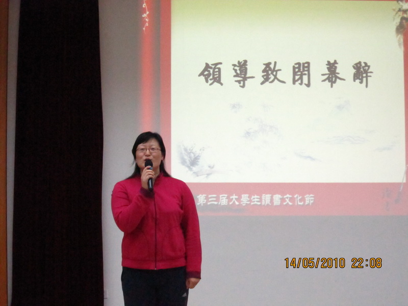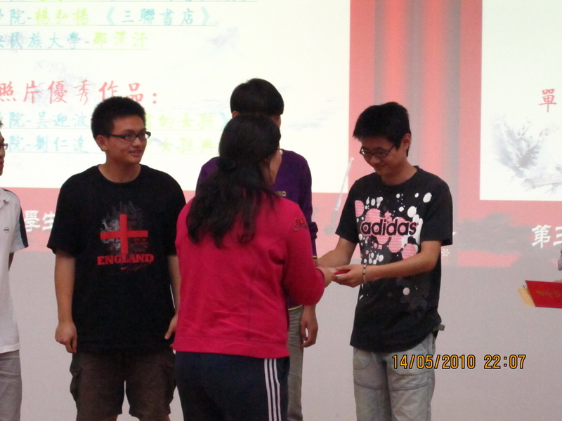 分团委书记胡志峰做了热情洋溢的讲话,她首先祝贺了本次读书文化节的顺利举行,并对读书文化节的各方面工作表示了肯定;同时引用冰心名言“读书好,好读书,读好书”倡导同学们通过阅读等多种方式不断地充实自我,提升综合素质。胡志峰老师还与梁振华老师共同为“光线图书馆”摄影比赛获奖者颁奖。最后,由胡志峰老师宣布第三届读书文化节圆满落幕。