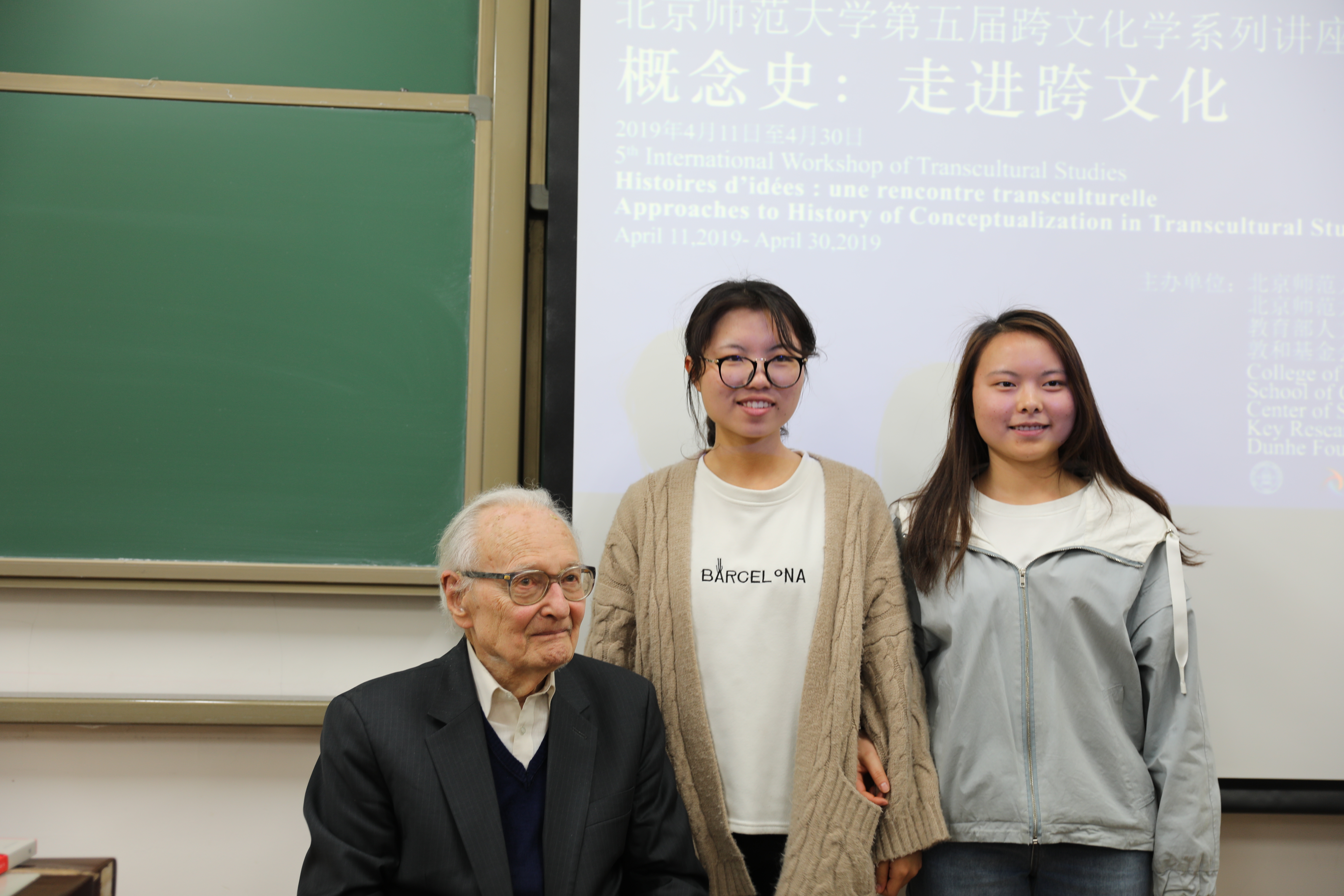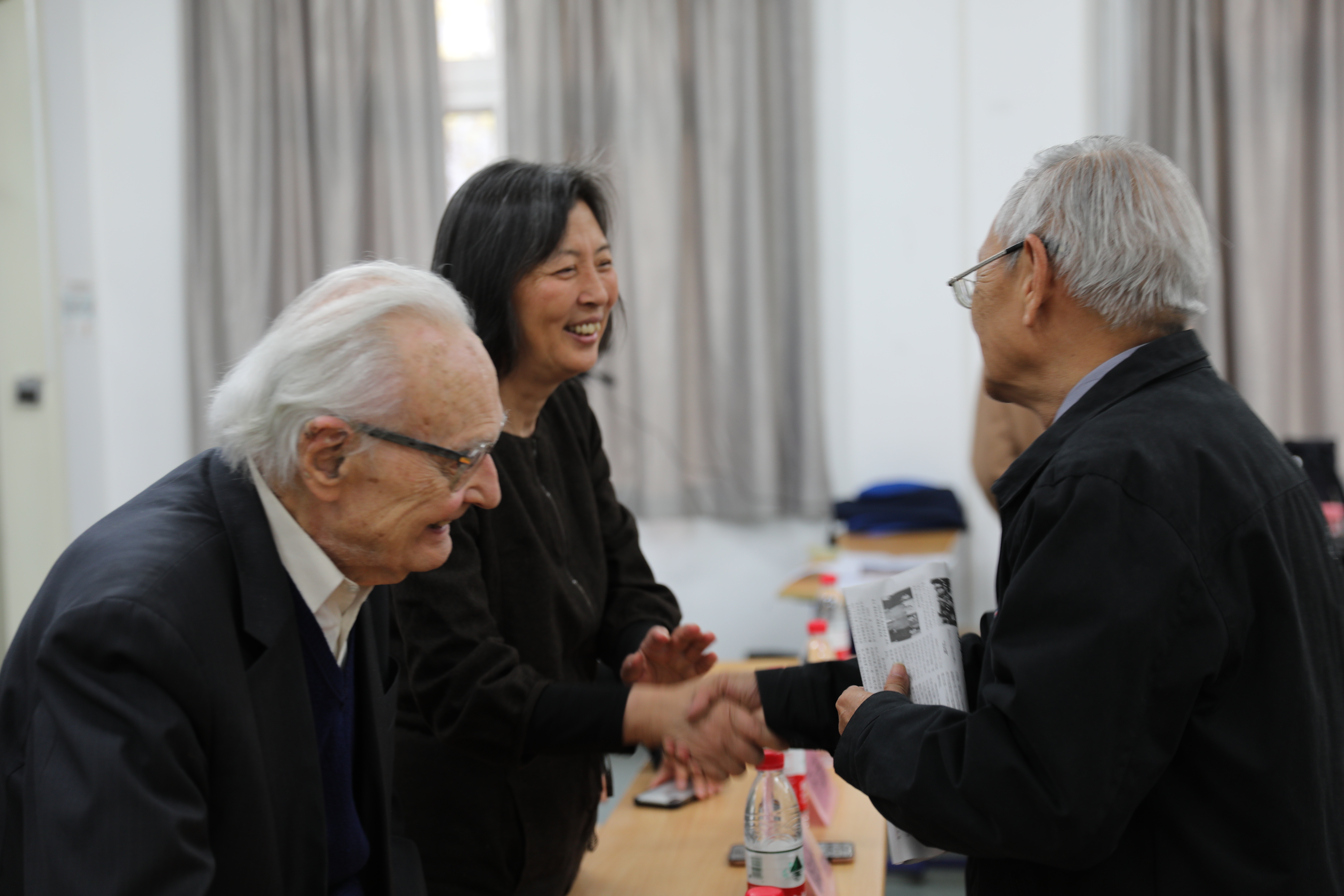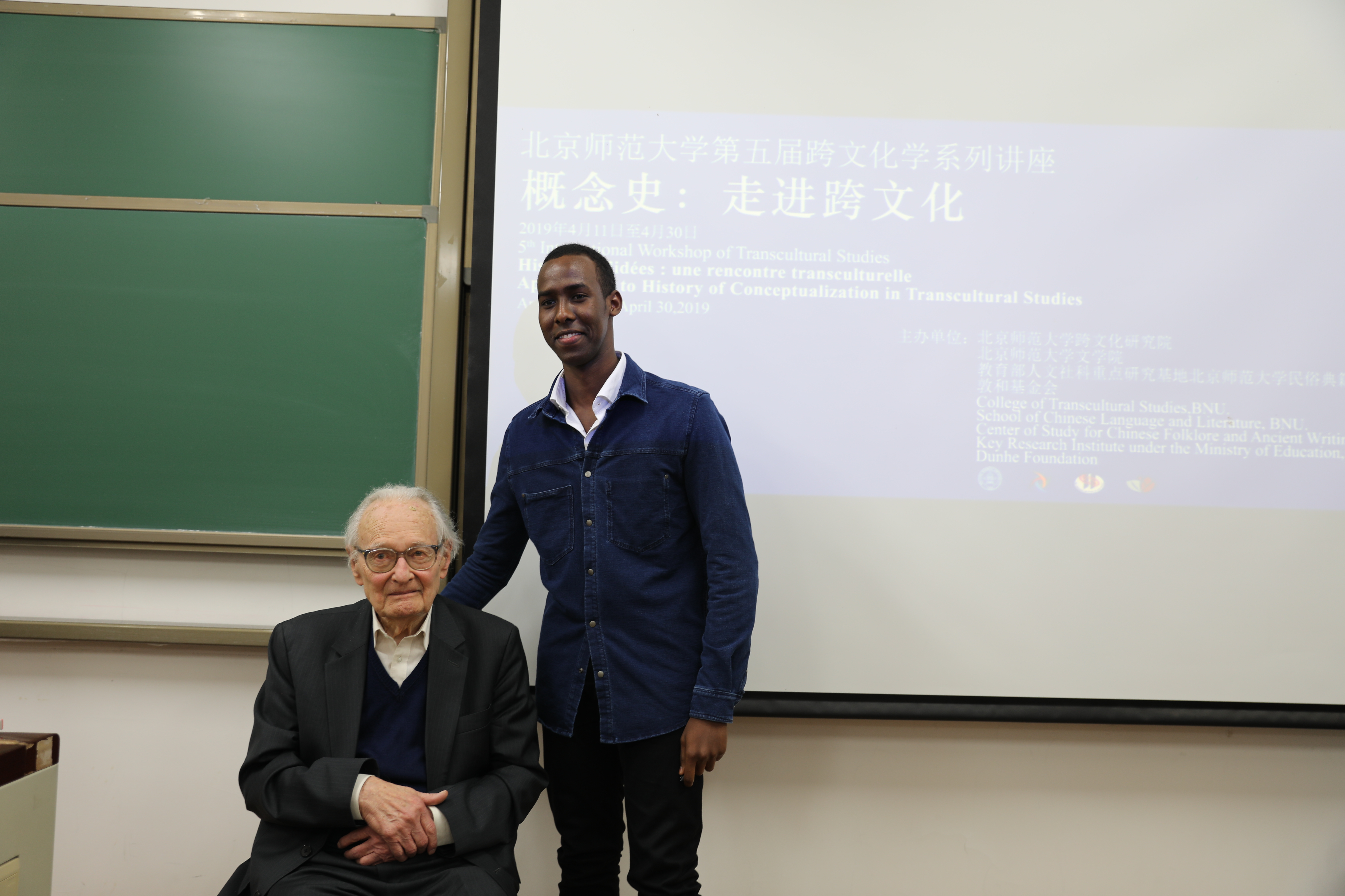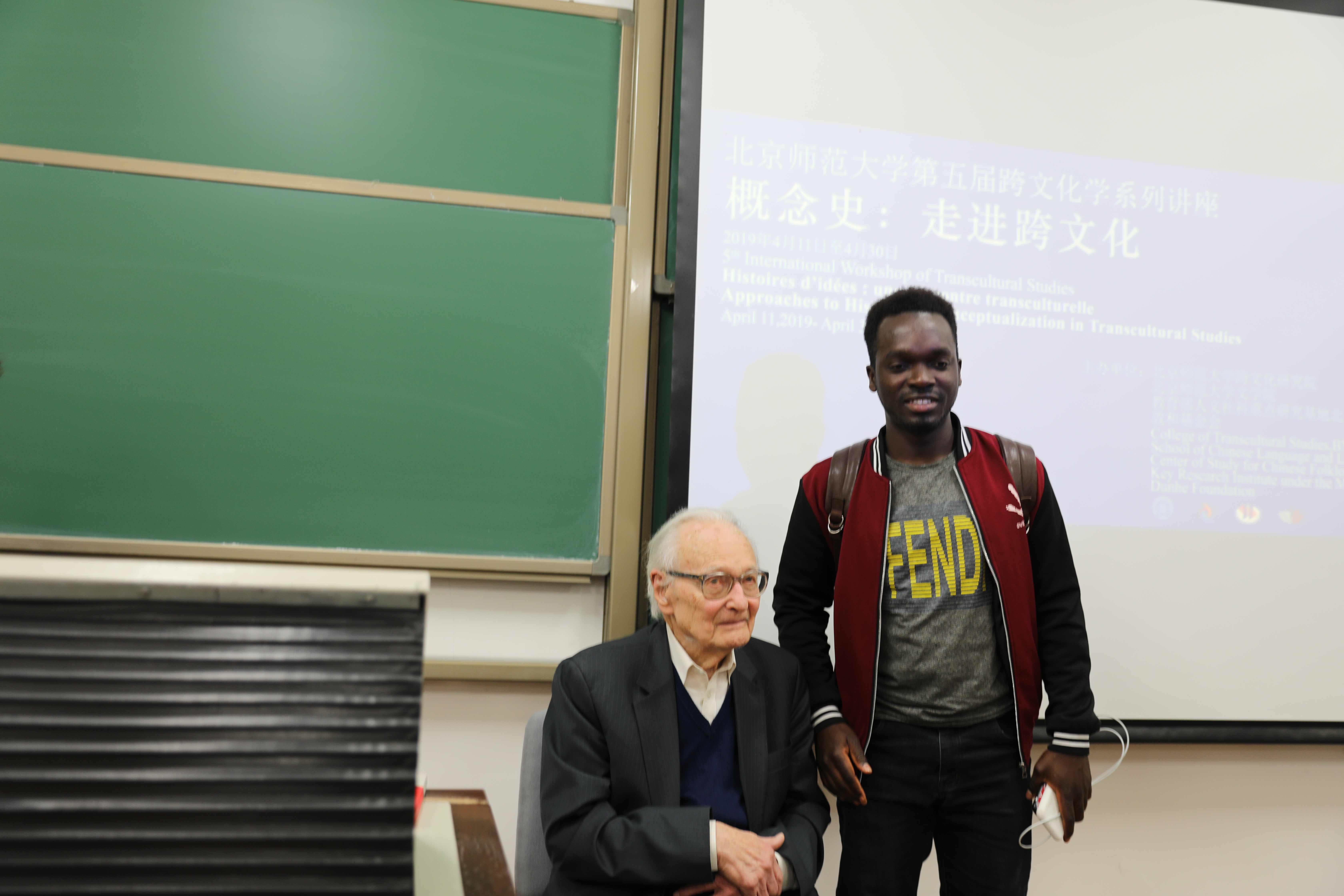 跨文化研究院师生和选修本课的本科生与部分其他院校和院系的研究生参加了开幕式的仪式活动,来自索马里和几内亚的非洲同学与中国同学一道,在热情、期待与憧憬中,度过了这美好一刻,并与中外教授合影留念。 (撰文/代唯一) 索马里留学生与汪德迈先生 几内亚留学生与汪德迈先生 中国同学与汪德迈先生 程正民先生与法国教授汪德迈、金丝燕互致问候 现场师生合影