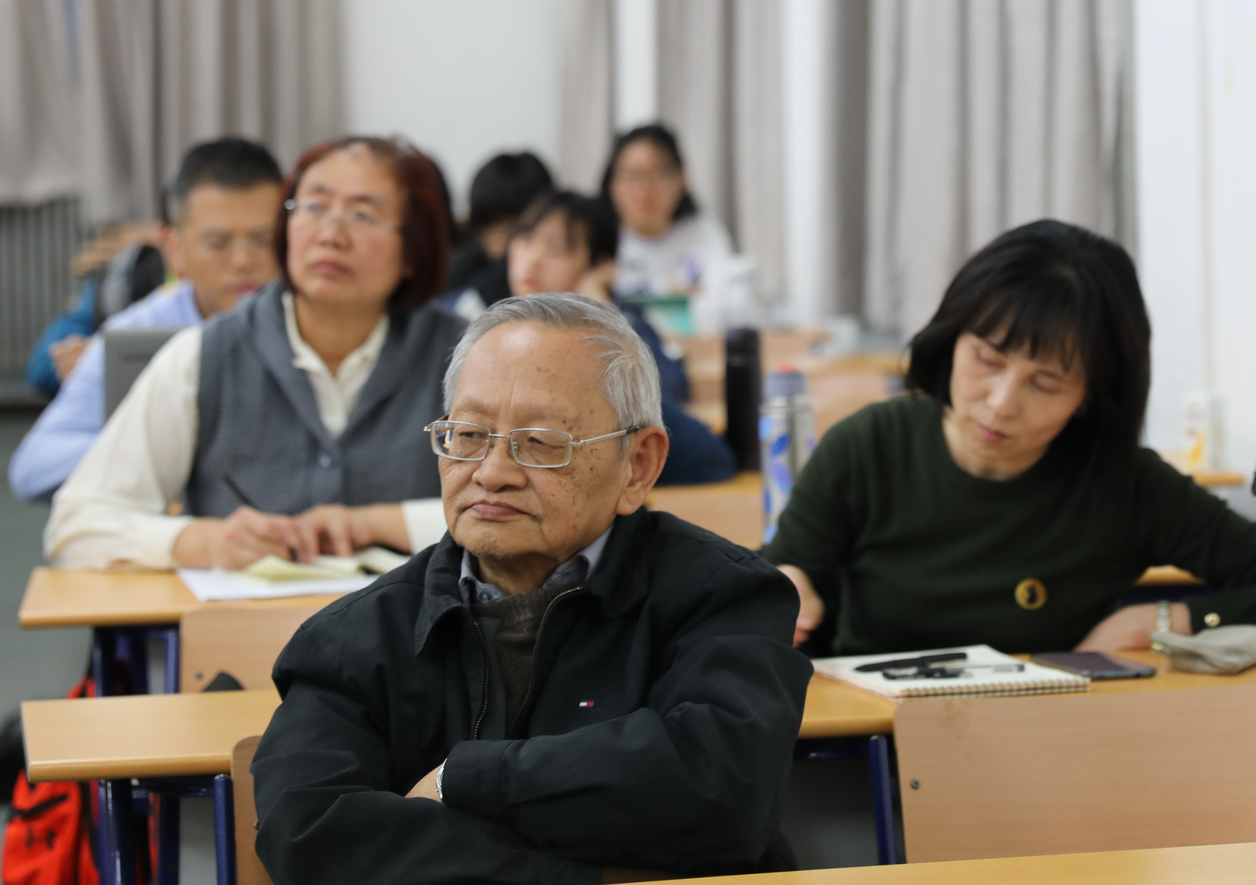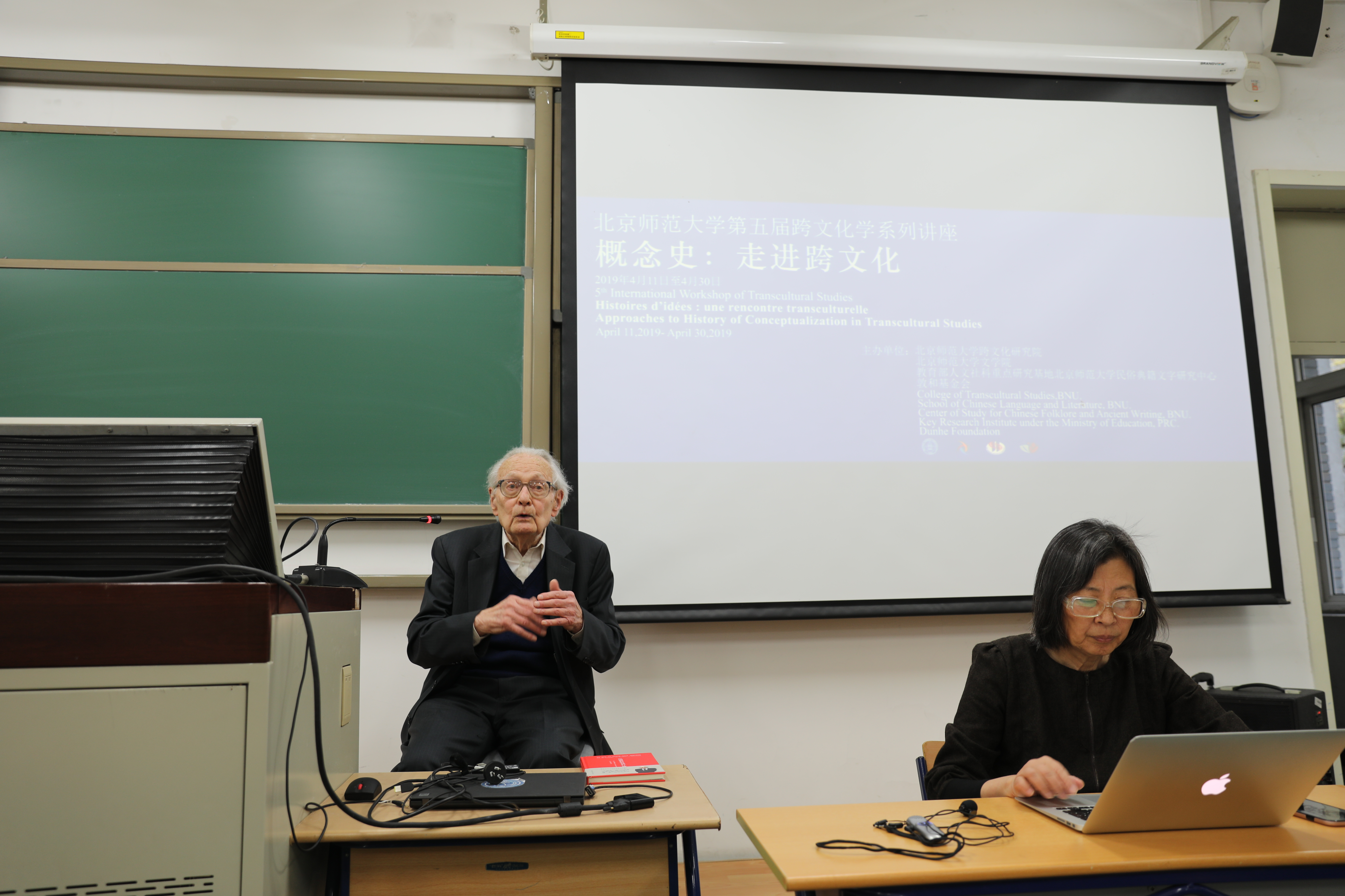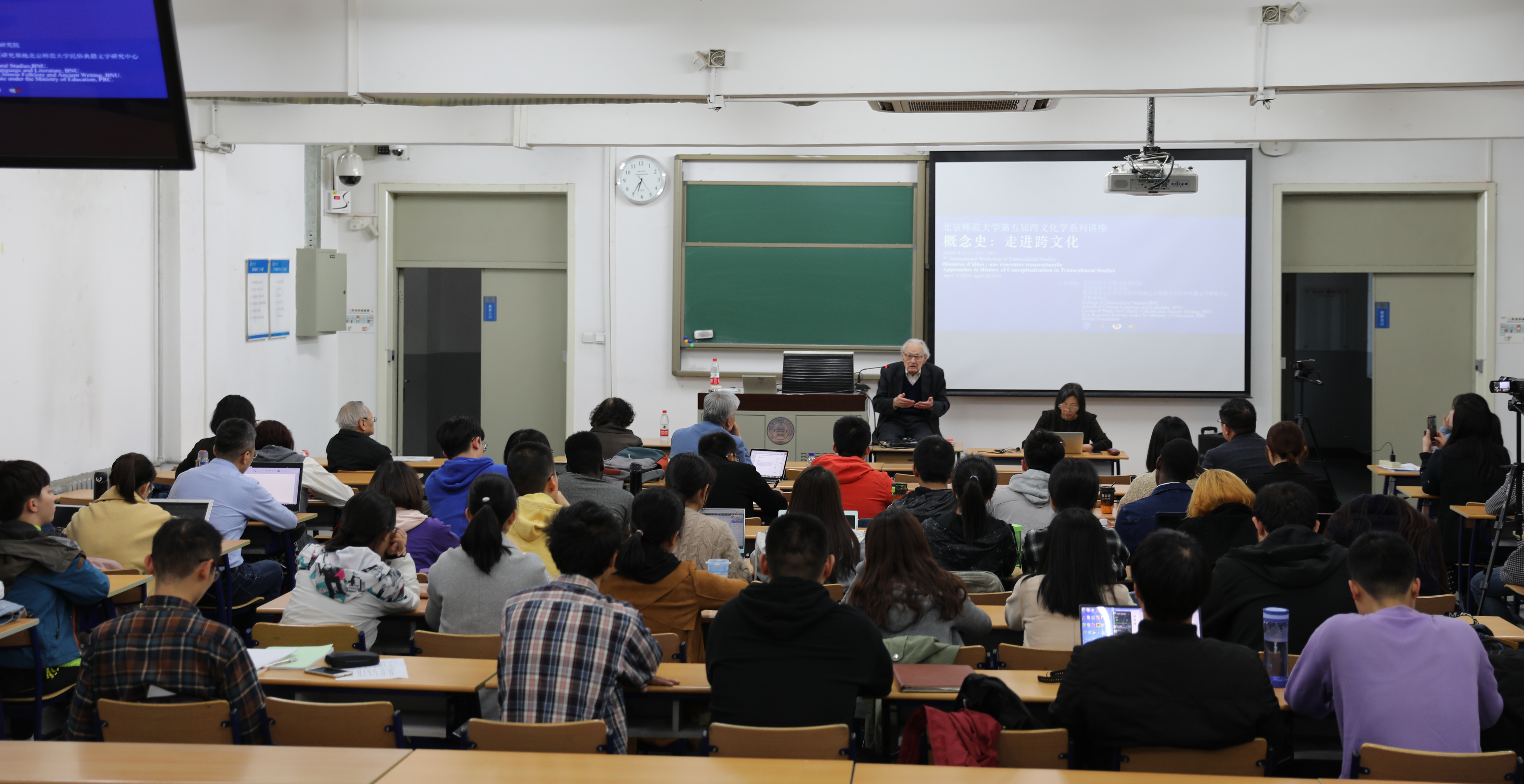 “跨文化研究”系列讲座(118) [内容提要]汪德迈先生的新著《中国教给我们什么》,从语言、社会、存在三层面,阐述中国文化特征。在语言层面,汉语汉字是举世无双的非自然语言和表意系统的精神财富。在社会层面,中国社会历史的独特性没有引起欧洲学者的注意,而被套用西方观点过度解释。在存在层面,从庄子到禅宗都展现出对汉语的深刻认识,今天西方当代艺术中的多位抽象性,在中国古代已经发生。 2019年4月12日晚6:00至8:00,法兰西学院通讯院士、法国高等社会科学研究院汪德迈教授在北师大教四201教室授课。 现场师生聚精会神听课 汪德迈先生已经连续五年为北师大跨文化学国际研究生课程班授课,此次为2019年春季跨文化学课程班“概念史:走进跨文化”系列讲座担任首讲,题目为《中国教给我们什么》。北师大跨文化研究院院长董晓萍教授与法国阿尔多瓦大学东方学系主任金丝燕教授共同主持了今天的讲座。北师大跨文化研究院学术委员会主任、巴赫金研究专家程正民先生,北师大漫画网站