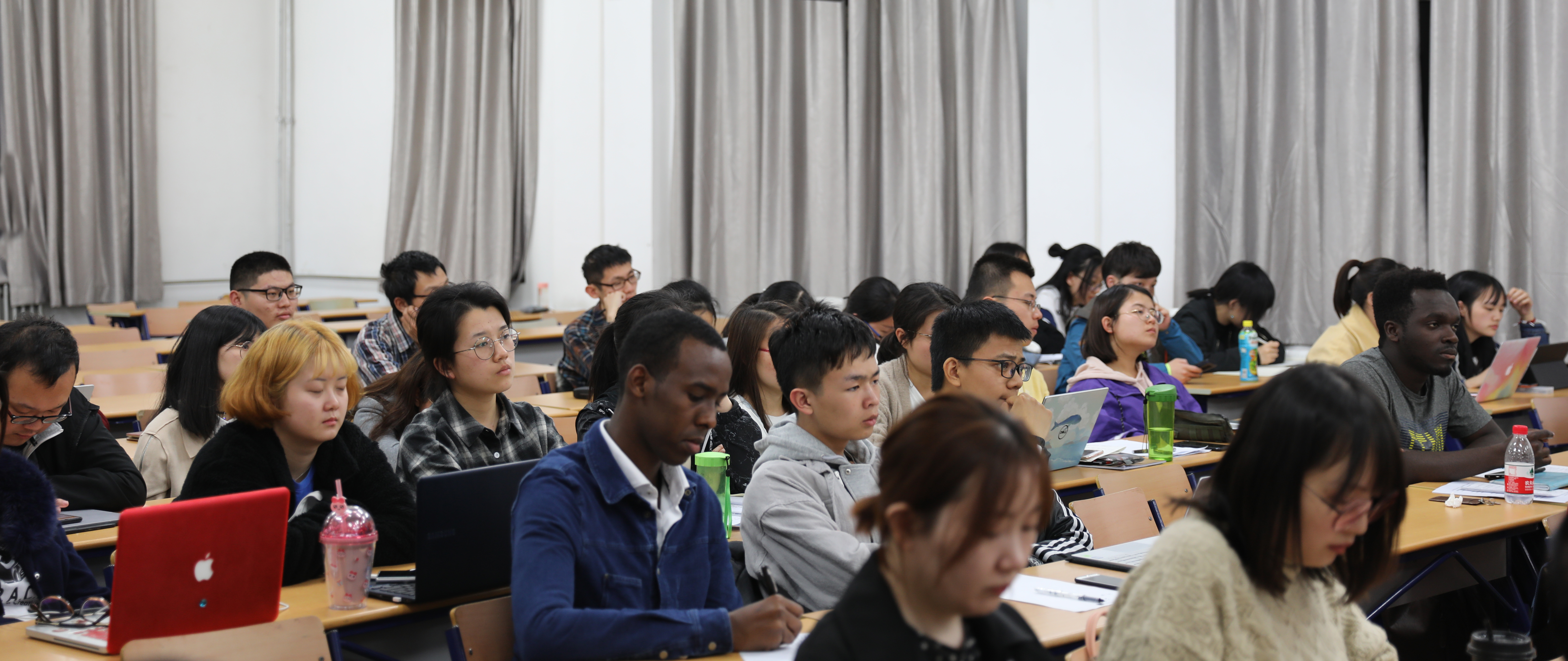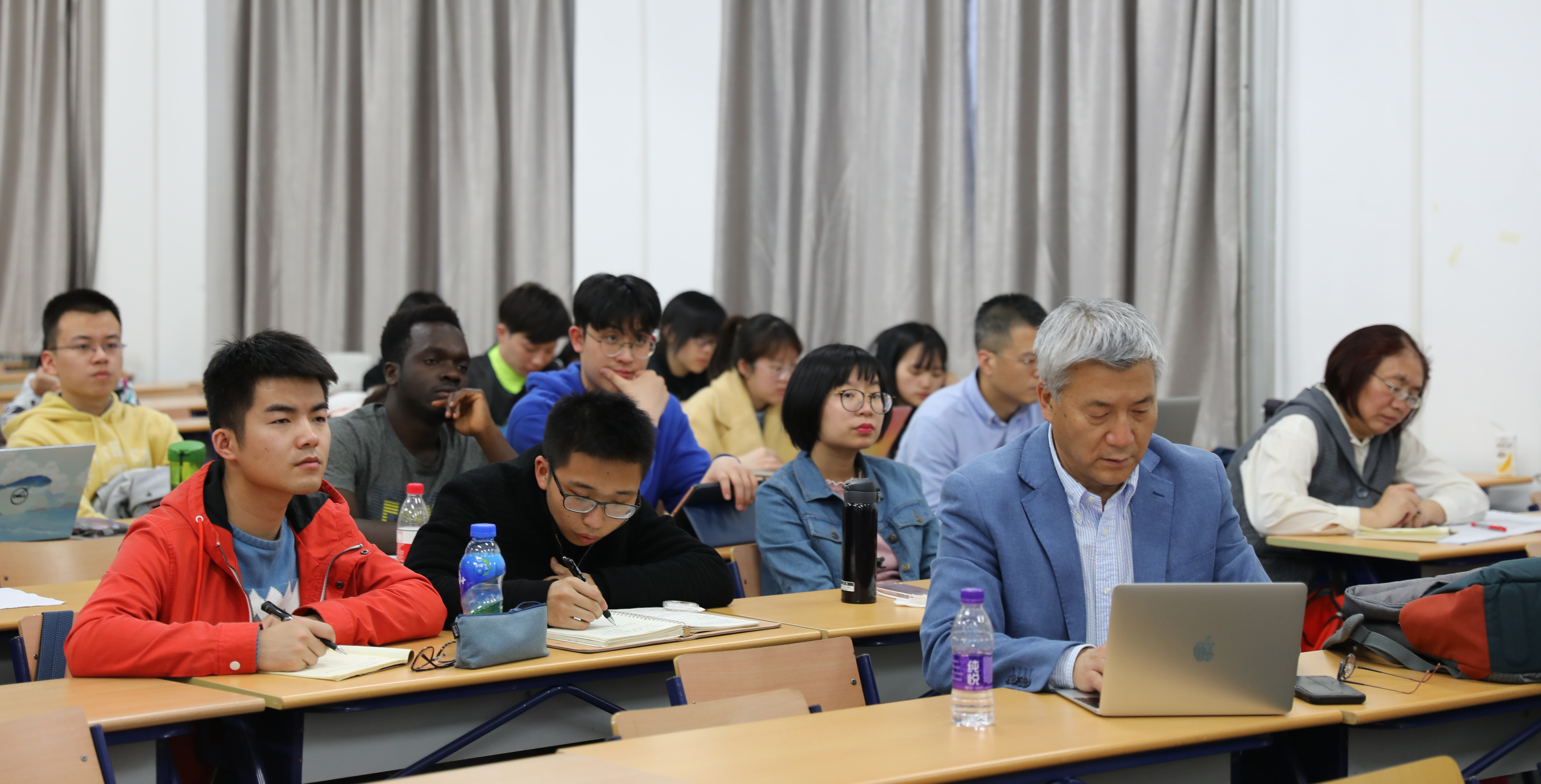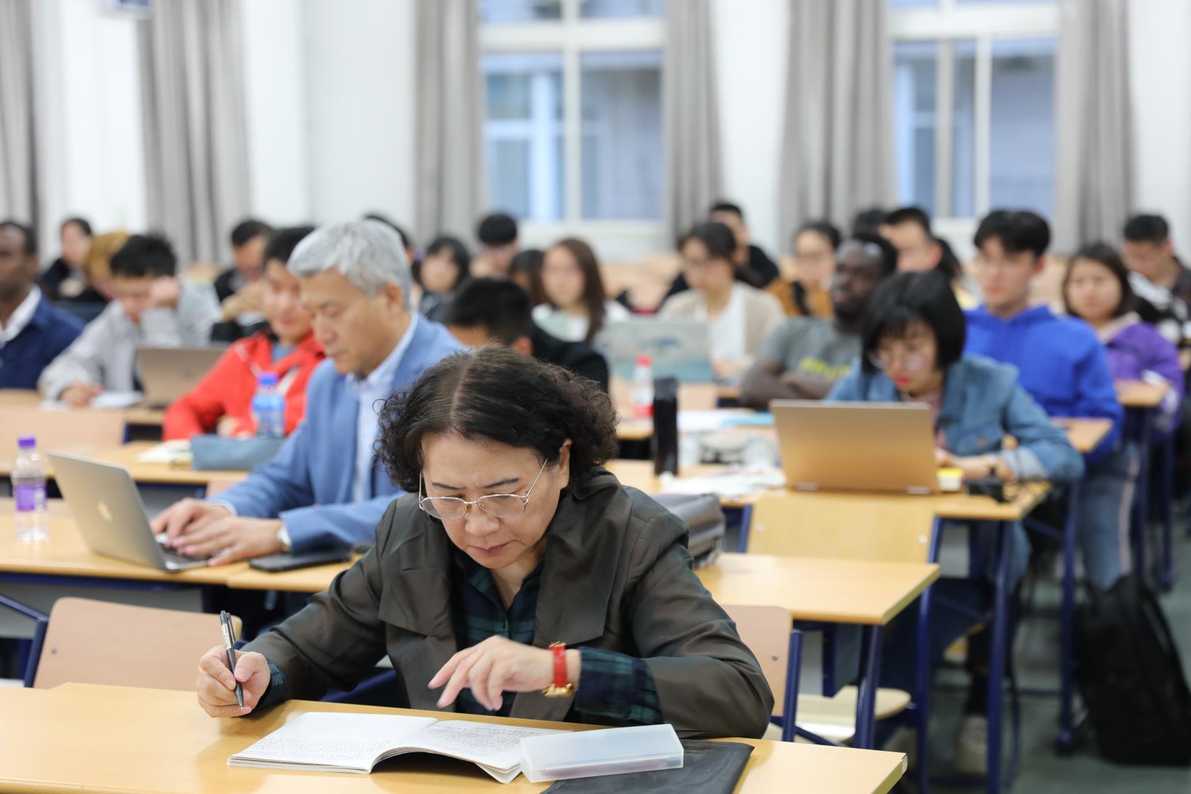 “跨文化研究”系列讲座(118) [内容提要]汪德迈先生的新著《中国教给我们什么》,从语言、社会、存在三层面,阐述中国文化特征。在语言层面,汉语汉字是举世无双的非自然语言和表意系统的精神财富。在社会层面,中国社会历史的独特性没有引起欧洲学者的注意,而被套用西方观点过度解释。在存在层面,从庄子到禅宗都展现出对汉语的深刻认识,今天西方当代艺术中的多位抽象性,在中国古代已经发生。 2019年4月12日晚6:00至8:00,法兰西学院通讯院士、法国高等社会科学研究院汪德迈教授在北师大教四201教室授课。 现场师生聚精会神听课 汪德迈先生已经连续五年为北师大跨文化学国际研究生课程班授课,此次为2019年春季跨文化学课程班“概念史:走进跨文化”系列讲座担任首讲,题目为《中国教给我们什么》。北师大跨文化研究院院长董晓萍教授与法国阿尔多瓦大学东方学系主任金丝燕教授共同主持了今天的讲座。北师大跨文化研究院学术委员会主任、巴赫金研究专家程正民先生,北师大漫画网站
