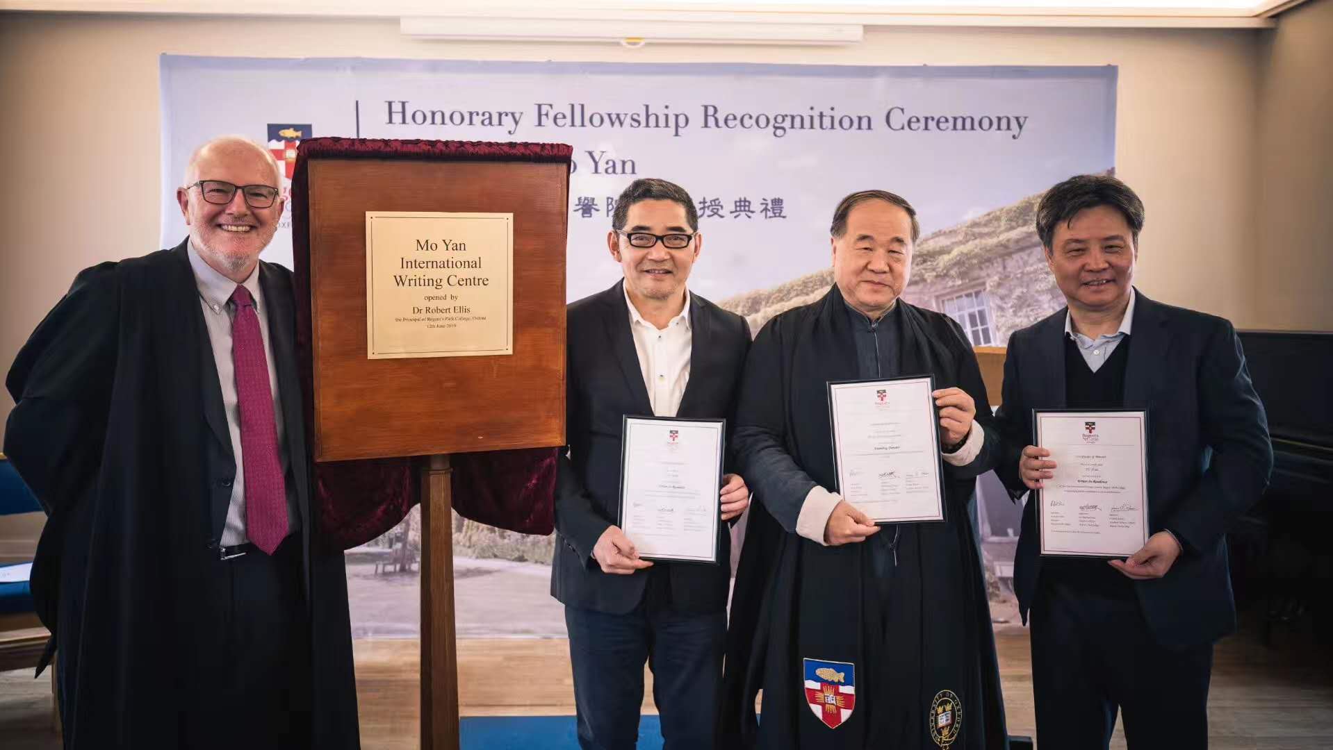 国际写作中心主任莫言荣誉院士称号。 牛津大学莫言国际写作中心也于同日举行了揭牌仪式,并聘任莫言为写作中心主任,聘任中国作家余华、苏童为驻校作家。据校方介绍,这是牛津大学第一个以中国作家名字命名的研究中心。 摄政公园学院院长罗伯特·埃利斯在颁授仪式上表示,莫言写了许多脍炙人口的作品,包括《红高粱》等小说被翻译成英语,在海外也颇受读者欢迎。“荣誉院士这一称号十分珍贵,目前为止被学院授予荣誉院士的人屈指可数。授予莫言这一称号既是对莫言在文学造诣上的肯定,也是近年来牛津大学与漫画网站