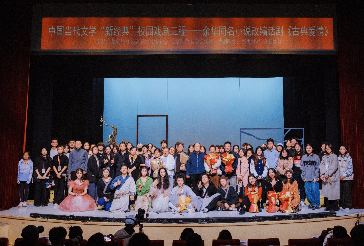 教授余华感谢大家对小说及话剧《古典爱情》的厚爱。此次改编基于《古典爱情》,辅以《鲜血梅花》,效果大放异彩;下回尝试《鲜血梅花》为主,《古典爱情》为辅,创造的大门又将继续敞开。余华表示,先锋小说戏剧化改编的成功实践,得益于北师大为学生成长成才提供的广阔舞台。希望主创团队进一步平衡剧作的文学性和哲理性,让北师大精品在首都乃至全国的巡演中传播开来,与更多喜爱文学、钟情戏剧的朋友们同在。 余华教授现场发言 先锋尤未改,思者征程长。上个世纪80年代,余华以《古典爱情》和《鲜血梅花》戏仿言情、武侠文学模式,用先锋思潮向古典命题发起挑战;三十多年过去,彼时先锋又成当下经典。凭借丰厚的文学基础与深切的社会关怀,北师大学子稳握经典传承、媒介交融的接力棒,在保持传统母题基本特性的同时,通过阐释、解构与重构,向世界艺术殿堂注入独属于这一时代青年群体的所思所想。 经过数年耕耘,“中国当代文学‘新经典’校园戏剧工程”通过打造《我们的荆轲》及《古典爱情》两部精品剧作,逐渐探索出一条扎根校园阵地、发挥枢纽优势、汇聚各方力量的戏剧创演之路。未来,项目将着力完善经典作品“搭台”、专家学者把关、青年学生“唱戏”的剧作打造和人才培养机制,以文体共通带动文学共创,用文艺共建实现文化共享。 领导嘉宾与主创团队合影 (文/张熹)