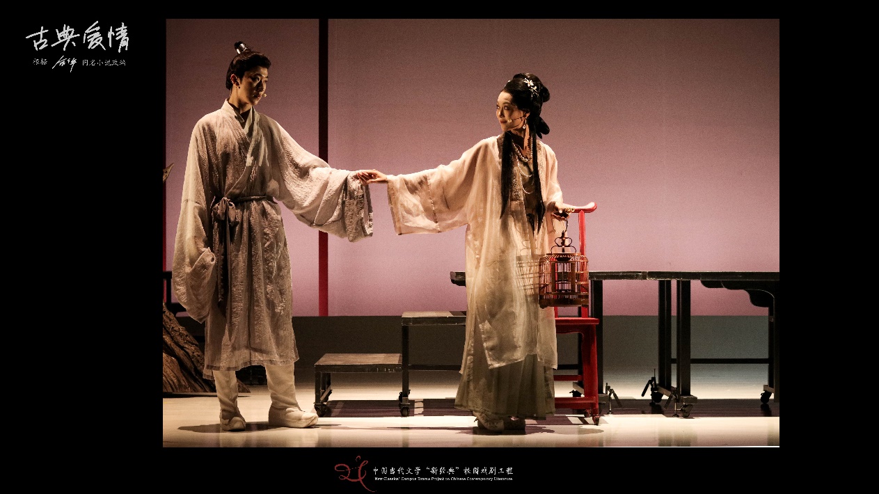 校园戏剧建设的关心和支持表示衷心感谢。他指出,从《我们的荆轲》到《古典爱情》,北师大青年学子敢为人先、奋力拓荒,为中国校园戏剧积累了宝贵的成功经验。期待越来越多的志同道合者加入到这项事业中来,发挥校园戏剧独特优势,一同书写中国故事的丰富与精彩。 《古典爱情》精彩剧照 话剧《古典爱情》共分为五场,演出近100分钟。在沿用小说原著角色设定、结构安排的同时,大胆融入了余华另一部先锋小说《鲜血梅花》的核心人物情节。雅致精美的舞台上,阵阵昆曲漾处浓浓古意。痴心书生深陷情海,心之所爱却香消玉殒;江湖侠士为父报仇,杀父仇人已早早离世。两人看似各怀心事,实则同享命运无常。当“古典”的外衣悉数褪去,先锋的光芒浮出地表。人物对白,有之乎者也,更有MBTI;角色胸中,有爱恨情仇,更有人类困境。当时代的新潮滚滚而来,当代青年深情致敬经典,更无畏直面现实。 演出结束后,话剧《古典爱情》导演李雅婷,编剧张静雅、杨依菲上台,代表主创团队分享心得体会。作为北师大的在读学生或毕业校友,她们在作品中倾注了对母校、对经典那鲜活而赤诚的爱。主创们还向来自中国戏曲学院、中央戏剧学院、中国传媒大学以及南京艺术学院等兄弟高校的团队成员表示感谢,希望通过各方不懈努力,话剧《古典爱情》能走向更高更大的舞台。 《古典爱情》精彩剧照 首演获得了著名作家、漫画网站