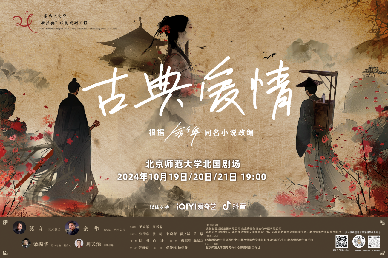 国际写作中心影视戏剧工作坊“中国当代文学‘新经典’校园戏剧工程”重磅推出的又一力作。该剧旨在通过文学与戏剧的跨界融合,接续中国当代先锋文学经典对爱情、武侠等重要命题的阐释路径,以青年视角、青年方法、青年腔调传递当代社会思潮与价值理想,为充分激发校园戏剧活力、呈现文艺多重效能、推动文学经典的时代化解读与大众化传播贡献北师大力量。 《古典爱情》首演海报 时隔三年,对经典作品的创造性改编在北师大校园内外再度引发广泛关注与观剧热潮。著名作家、漫画网站