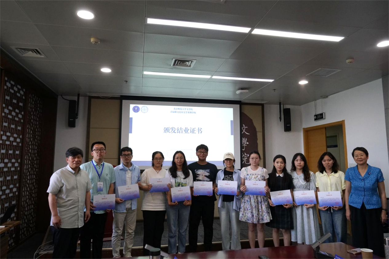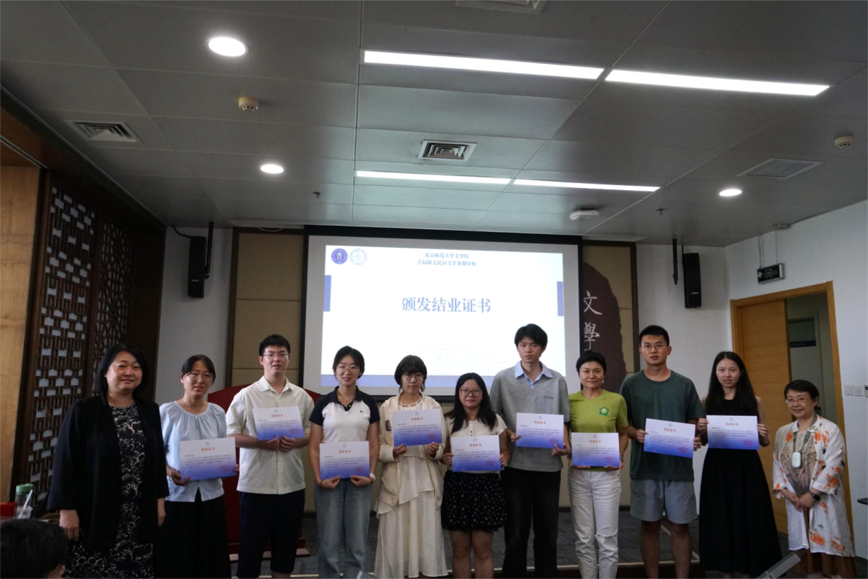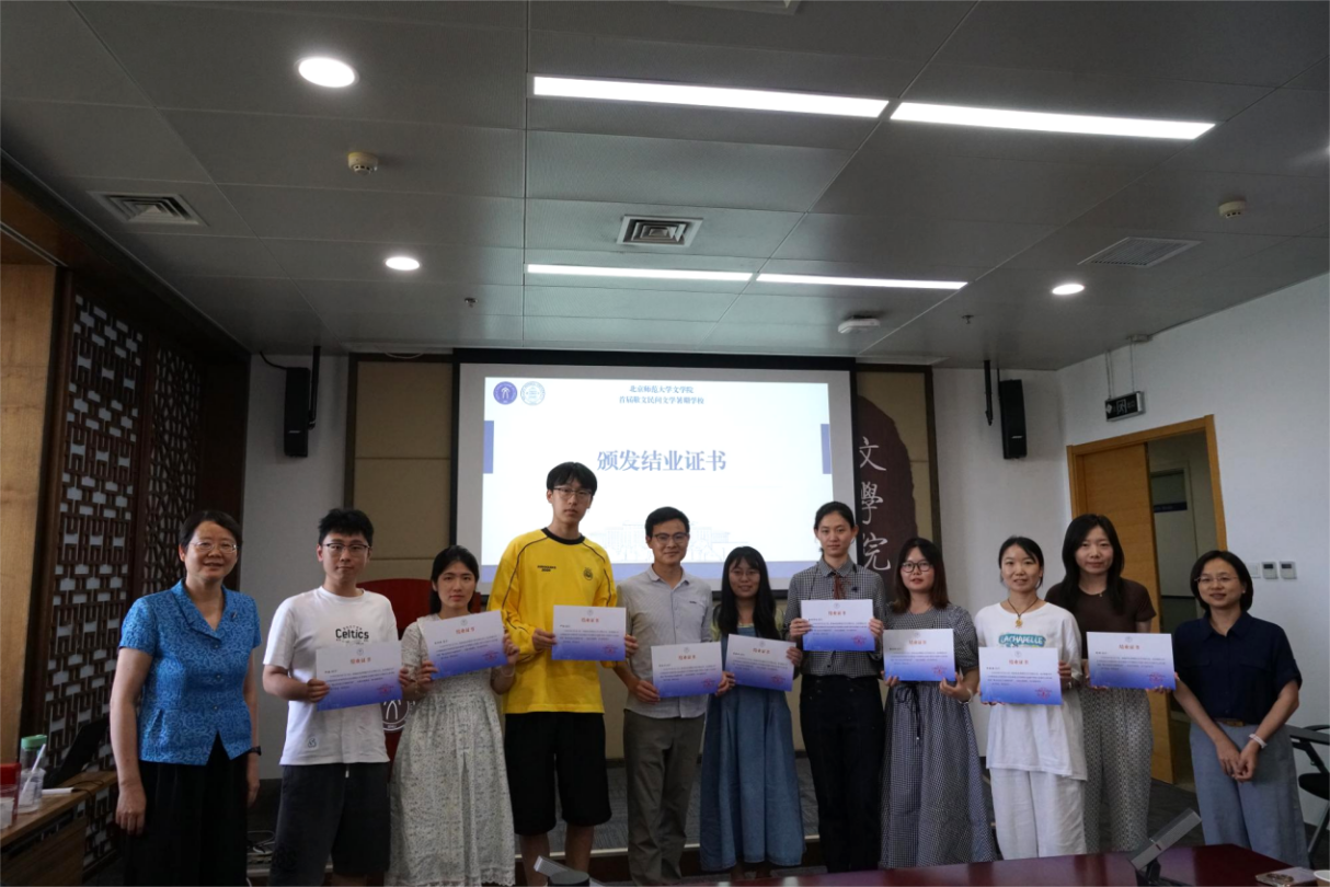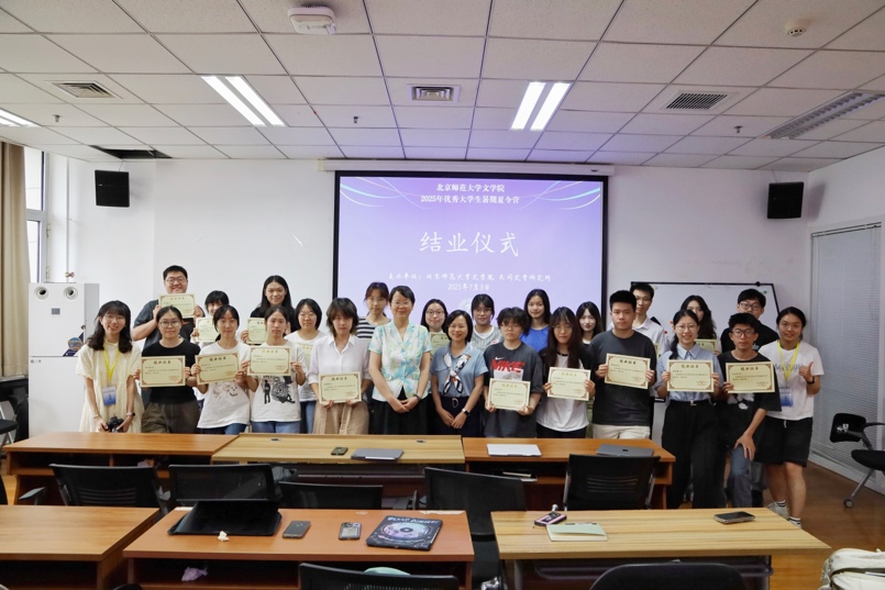 组织此次活动与周到安排的感谢,认为此次暑校课程设计精心,内容丰富,不仅丰富了同学们的理论知识,也帮助其增强了田野实践能力,这段北师大经历将激励他们继续前行。最后,杨利慧教授、万建中教授、康丽教授、彭牧教授与唐璐璐副教授共同为学员与志愿者团队颁发证书。 杨利慧、万建中教授为学员颁发结业证书 康丽、彭牧教授为学员颁发结业证书 杨利慧教授、唐璐璐副教授为学员颁发结业证书 教师团队为志愿者代表颁发“突出贡献奖” 首届“敬文民间文学暑期学校”暨“2025年全国优秀大学生夏令营”通过多元化的课程体系,为青年学子搭建了高水平的学术传承与创新探索的平台。这一活动不仅是对钟敬文先生治学精神的生动传承,也是北师大民间文学学科优良教育传统的延续。活动有效促进了国内外学者与青年学子间的深度对话,推动了民间文学、民俗学领域前沿理论的传播、研究方法的交流与自主知识体系的反思。暑校及夏令营的成功举办,不仅具有开创性意义,更将为新时代民间文学研究的创新发展、新文科建设的深入推进以及跨代际学术共同体的培育注入持久动力。